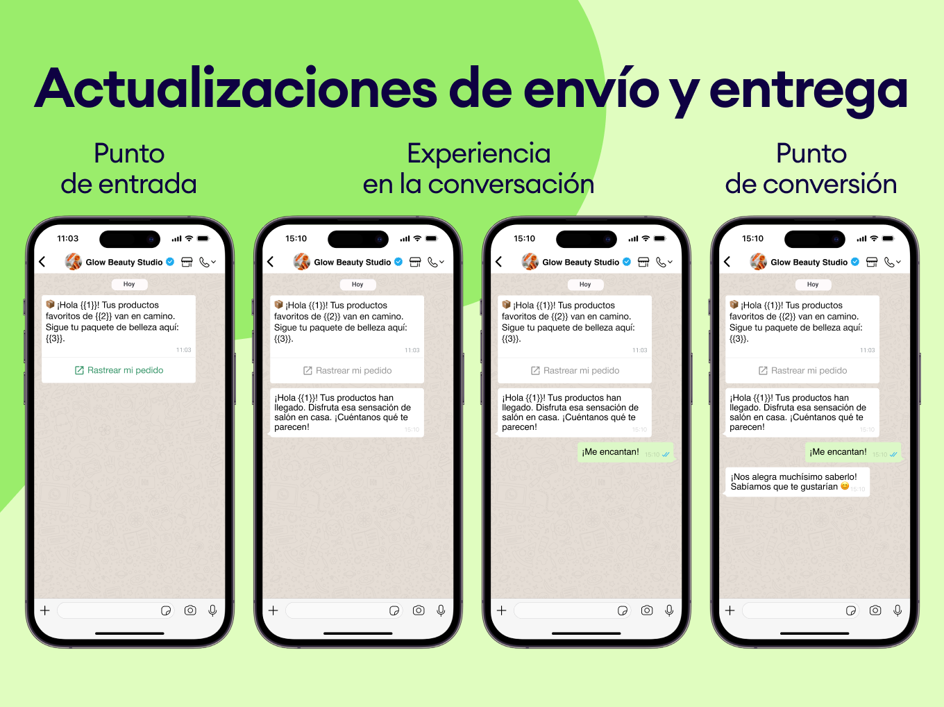 Los mensajes de plantilla de WhatsApp te ayudan a reflejar de forma consistente la voz de tu marca en cada interacción con tus clientes. Con estas plantillas, puedes enviar actualizaciones elegantes y visualmente atractivas que combinen con la estética de tu negocio.