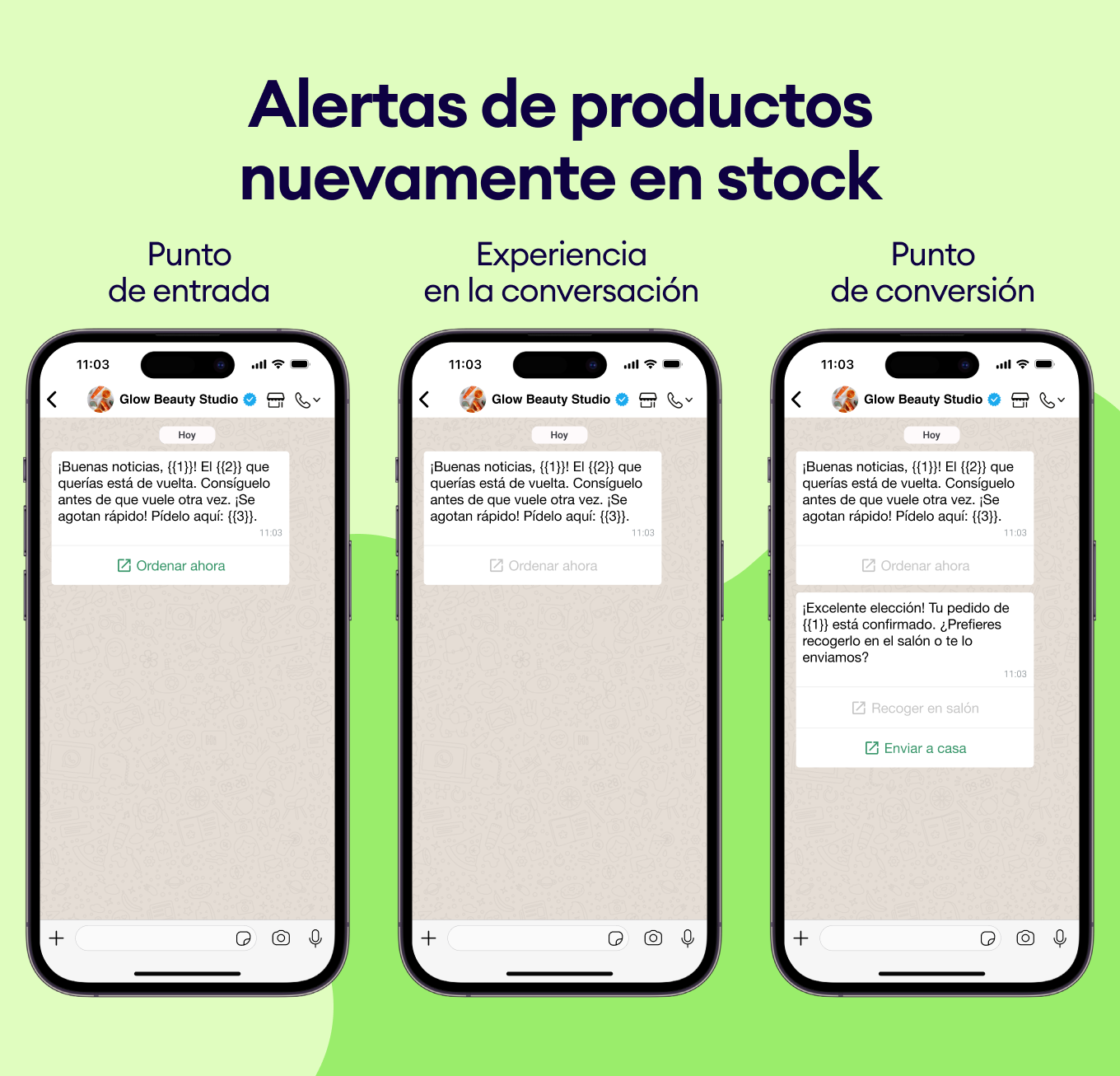 Informa a tus clientes por WhatsApp cuando tratamientos o productos populares vuelvan a estar disponibles, con actualizaciones clicables.