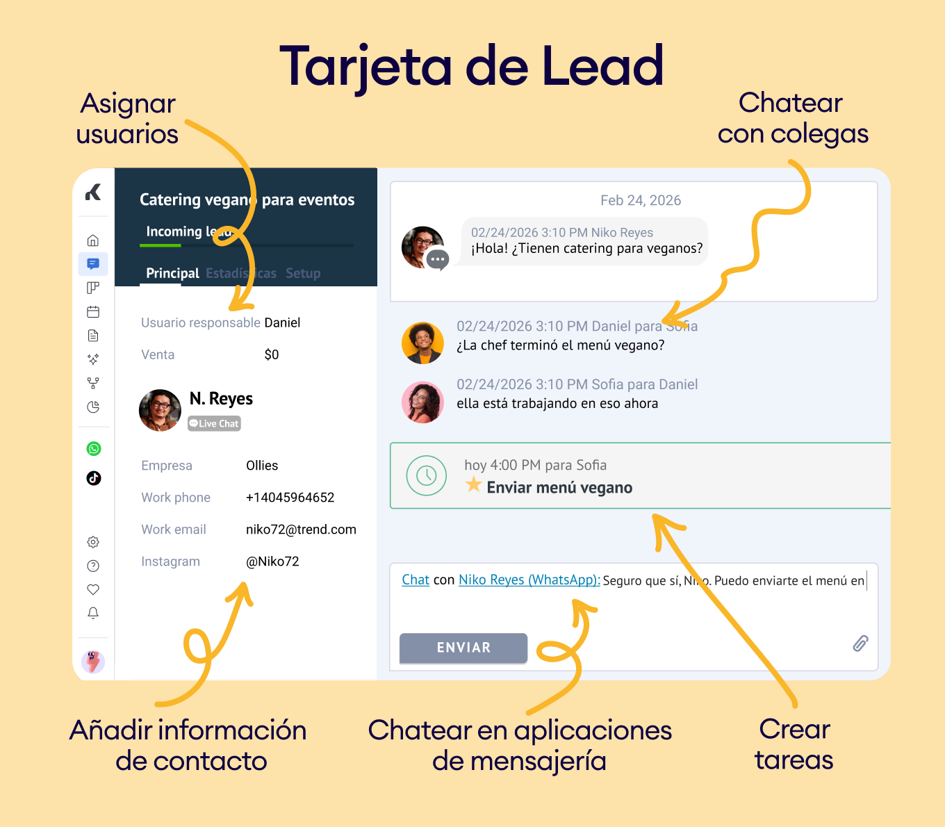 Cada cliente es único, y esto también se aplica al tipo de conversaciones que tienes con ellos. Kommo te permite crear un perfil personal para cada visitante que contacte contigo en el chat en vivo. Esto te ayuda a comprender el comportamiento y las preferencias de cada cliente en todos los equipos y usuarios. De este modo, conservas los datos de los clientes y evitas la falta de comunicación dentro de los equipos.