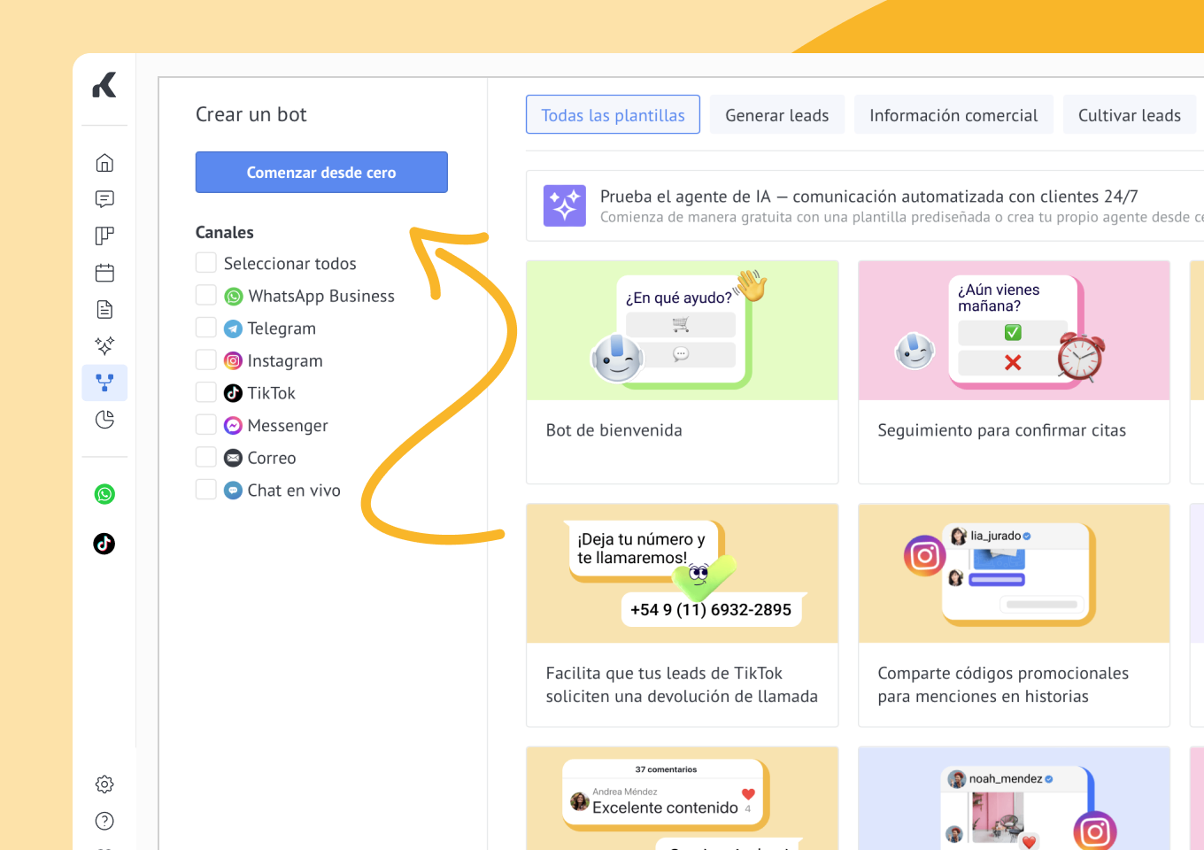 Haz clic en WhatsApp en el menú izquierdo de la plataforma, y luego Plantillas & Bots.