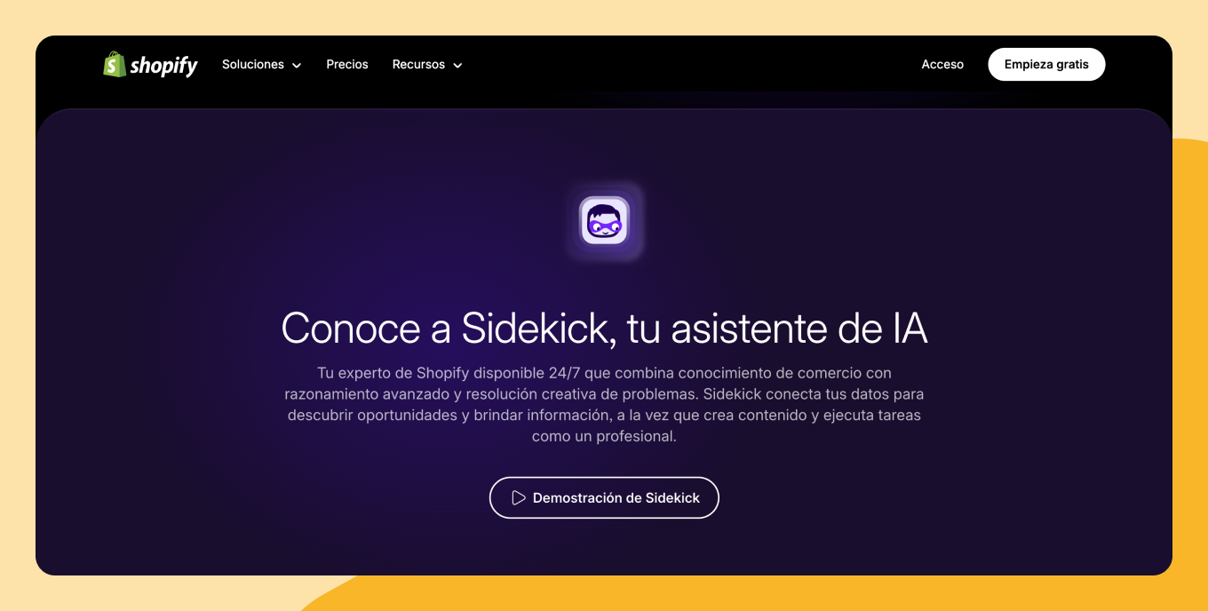 Shopify AI impulsa a los comerciantes a través de dos herramientas clave: Shopify Magic, que automatiza de forma inteligente la creación de contenidos, y Shopify Sidekick, un asistente basado en chat que responde preguntas y ejecuta tareas. En conjunto, estas soluciones de inteligencia artificial para Shopify ayudan a optimizar operaciones, mejorar la productividad y ofrecer recomendaciones basadas en datos directamente dentro de tu flujo de trabajo.