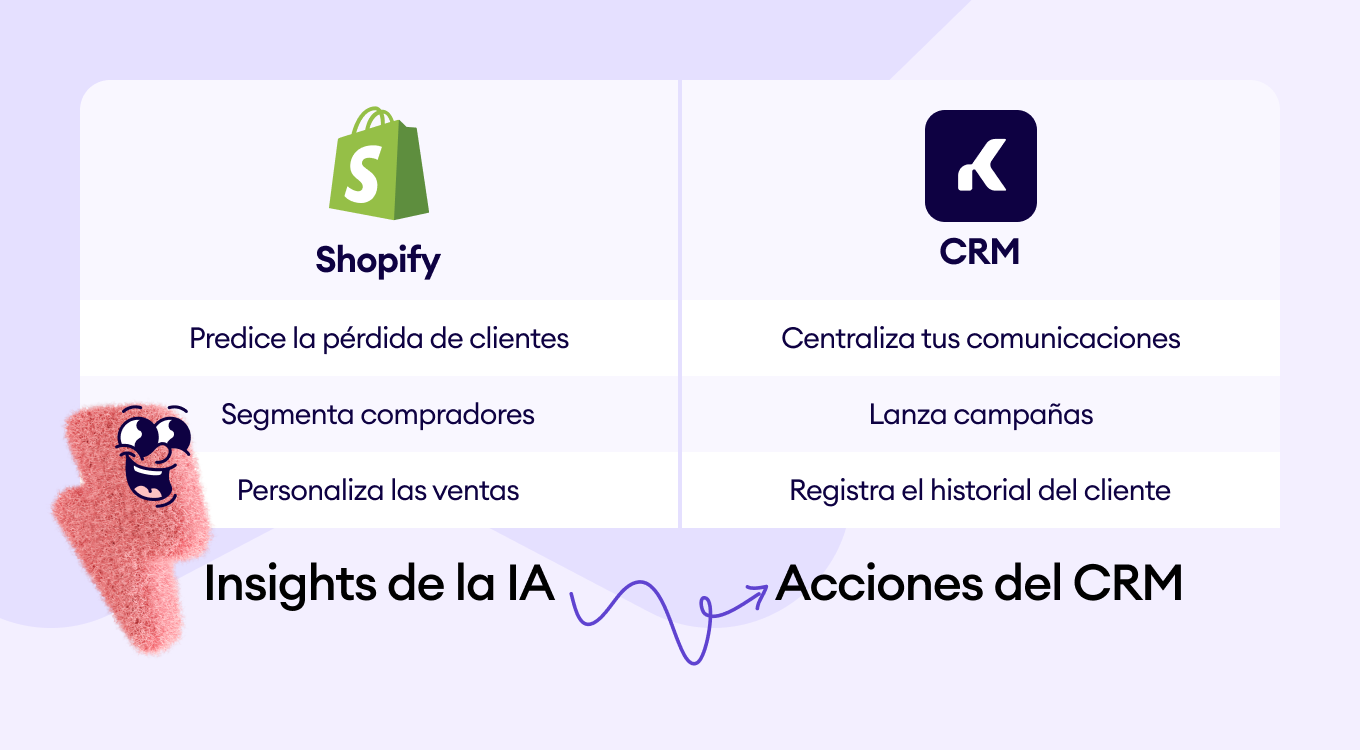Los negocios que utilizan Shopify AI necesitan apoyo de un CRM porque la IA genera los insights, pero es el CRM el que permite convertirlos en acciones concretas.