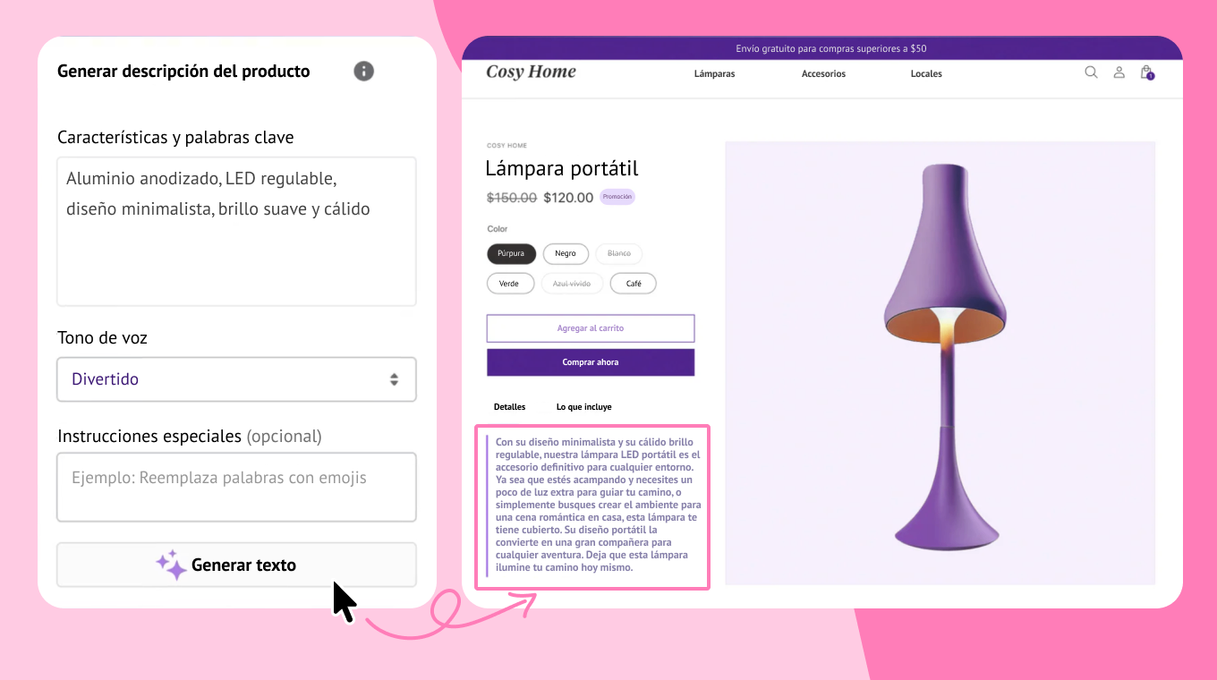 - Permite generar automáticamente descripciones de productos y contenidos para tu tienda.