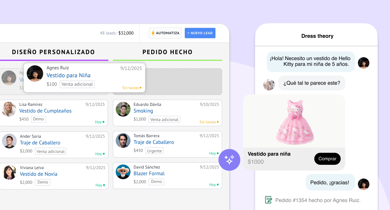 - El CRM es donde actúas sobre esos segmentos: gestionas conversaciones por WhatsApp, automatizas respuestas a comentarios de Instagram, sincronizas consultas de TikTok, asignas tareas de seguimiento a tu equipo, construyes un historial completo más allá de las compras y registras todas las conversaciones en una línea de tiempo unificada del cliente.