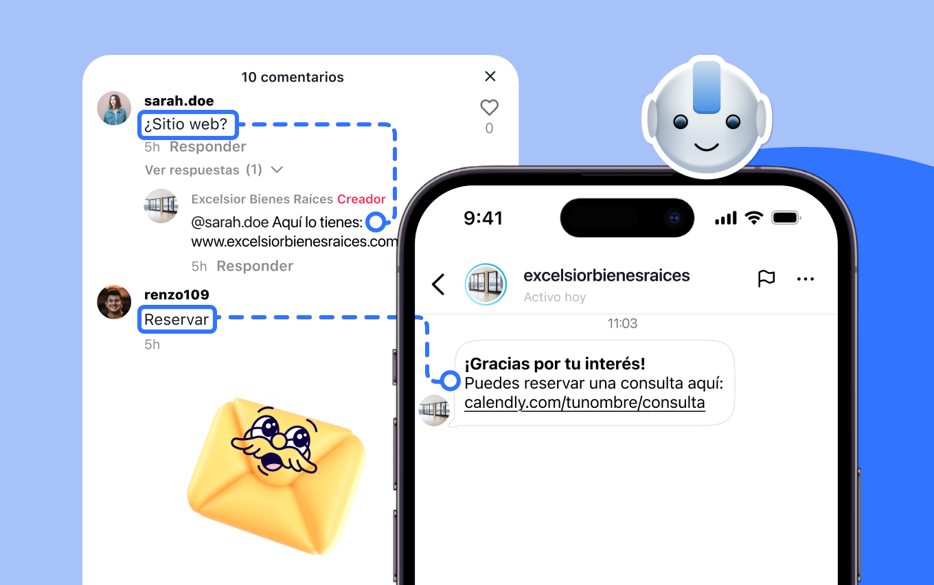 Con el Salesbot de Kommo, tú llevas el control. Crea disparadores basados en palabras clave que publiquen enlaces al instante en los comentarios o envíen información de reservas directamente a la bandeja de entrada de tus clientes. Es una forma rápida y sin esfuerzo de mantener las respuestas relevantes y tu engagement al máximo, de manera automática.