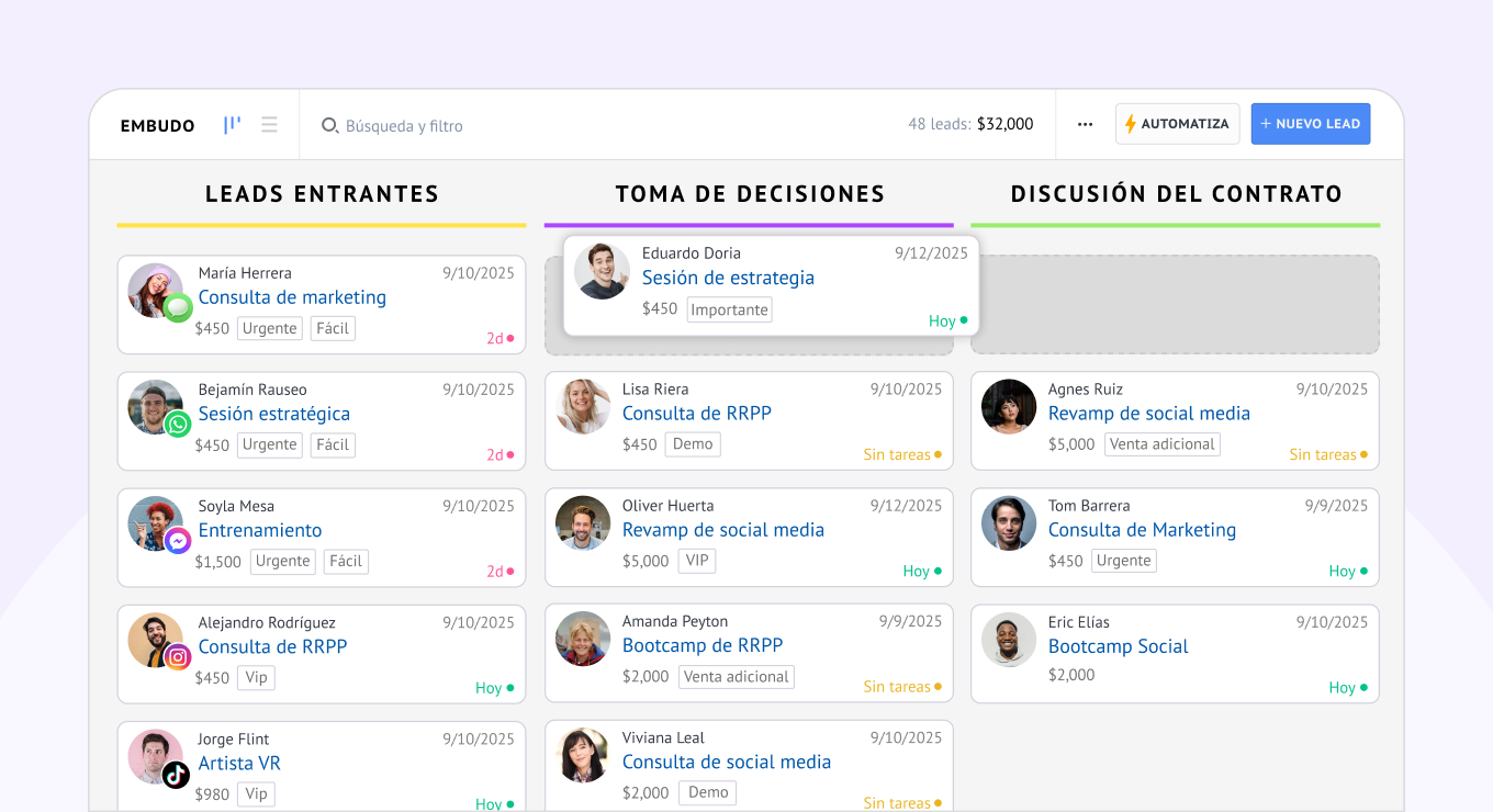Kommo es un CRM impulsado por IA que centraliza todos tus canales de comunicación (WhatsApp, TikTok, Instagram, correo) en una sola plataforma. Esto te permite automatizar la interacción con chatbots, agentes de IA y más.