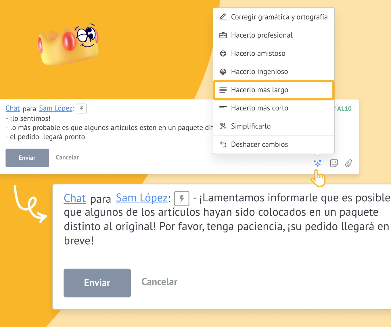 Despídete de las respuestas genéricas. Kommo AI analiza la voz de tu marca y mejora tus borradores con mensajes auténticos. ¿Necesitas que sean más cortos, divertidos o profesionales? Solo escribe un borrador y Kommo AI lo perfecciona.