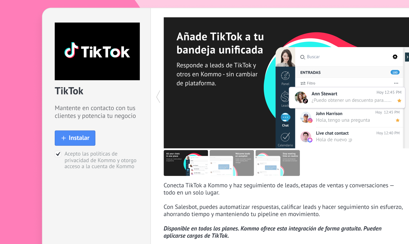 Kommo es uno de los primeros CRM en integrar TikTok. Su integración centraliza todos tus mensajes de TikTok en una bandeja y convierte automáticamente conversaciones en leads.