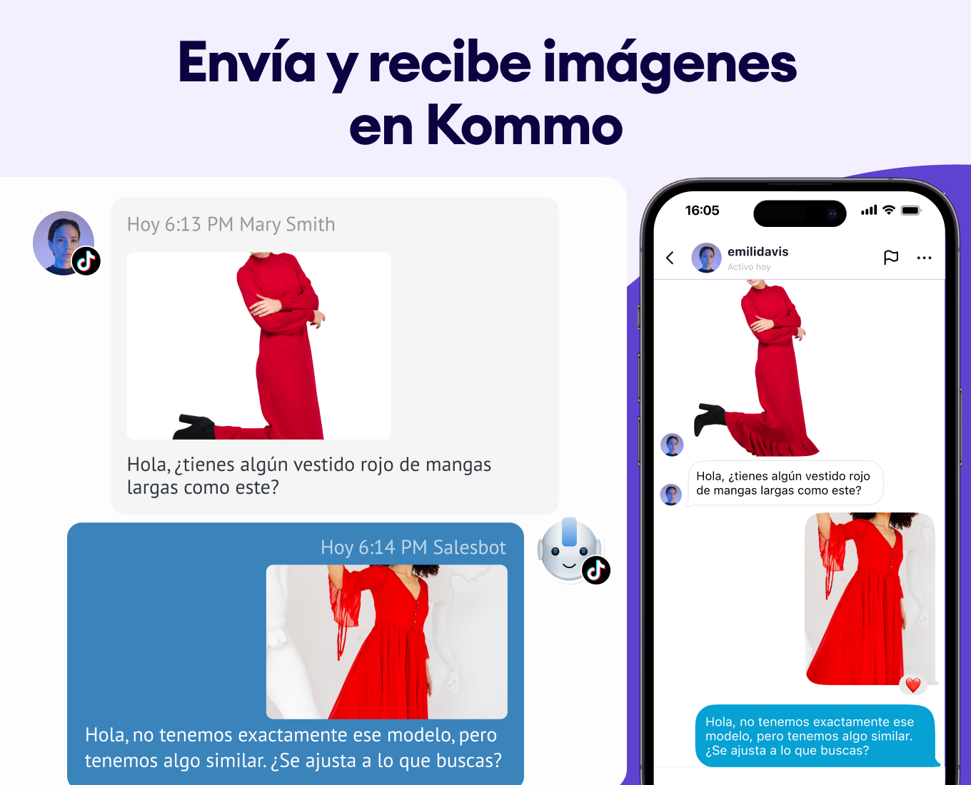 La integración de Kommo con TikTok te permite compartir imágenes dentro del chat, lo que abre la puerta a demostraciones de producto más claras y conversaciones que realmente generan conexión con tus clientes.