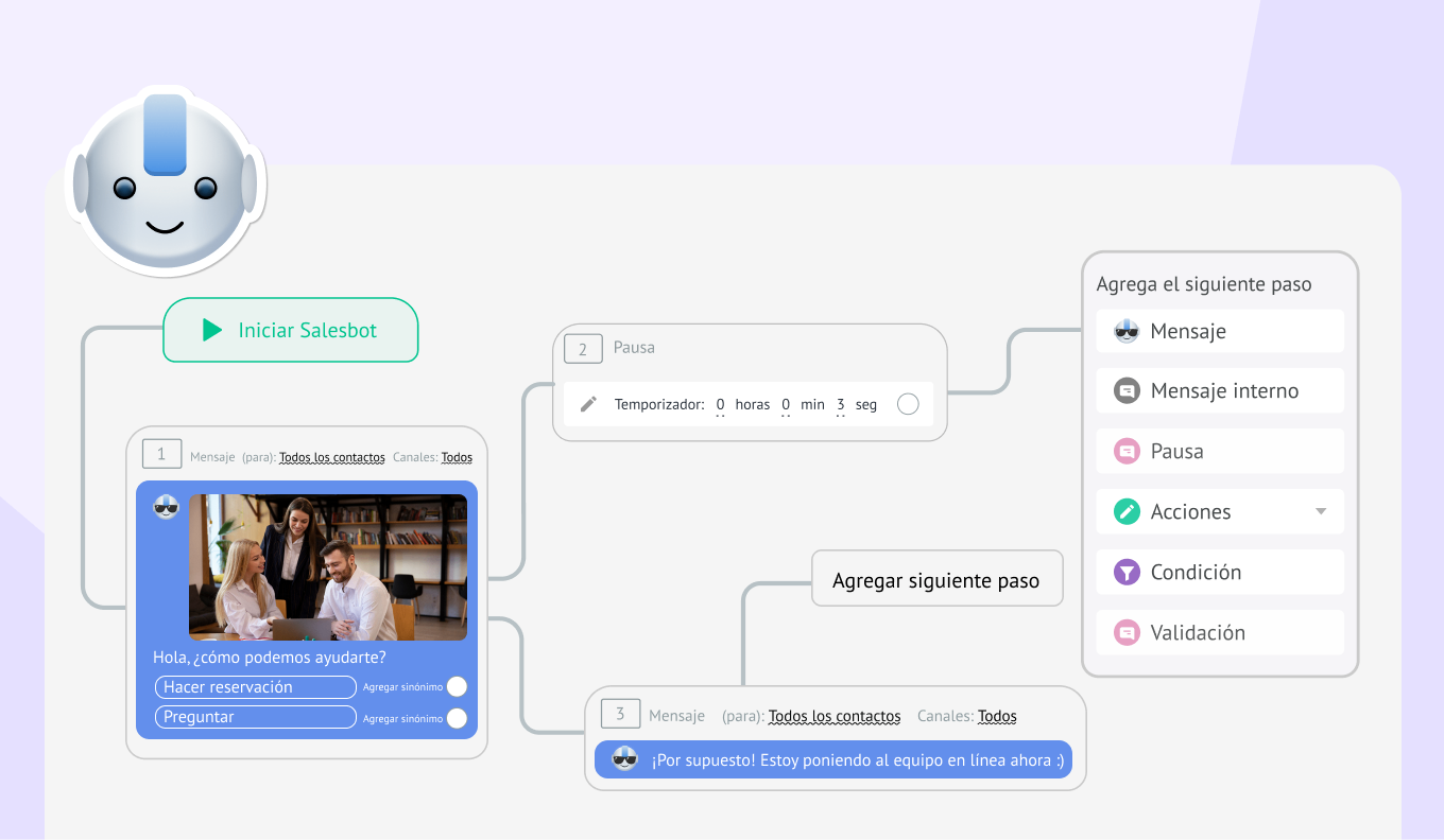 Con el chatbot de Kommo, también conocido como Salesbot, puedes configurar bots inteligentes sin código que se pongan en contacto con tus clientes potenciales, recopilen información, califiquen y asignen leads, sin intervención humana.