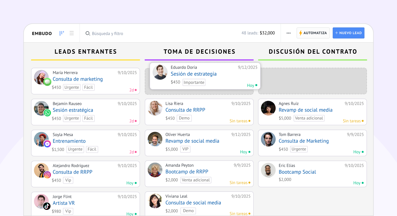 La bandeja de entrada unificada de Kommo funciona como tu centro de mando único, consolidando los chats de todos los canales en un feed fluido, lo que garantiza que tu equipo nunca pierda un lead.