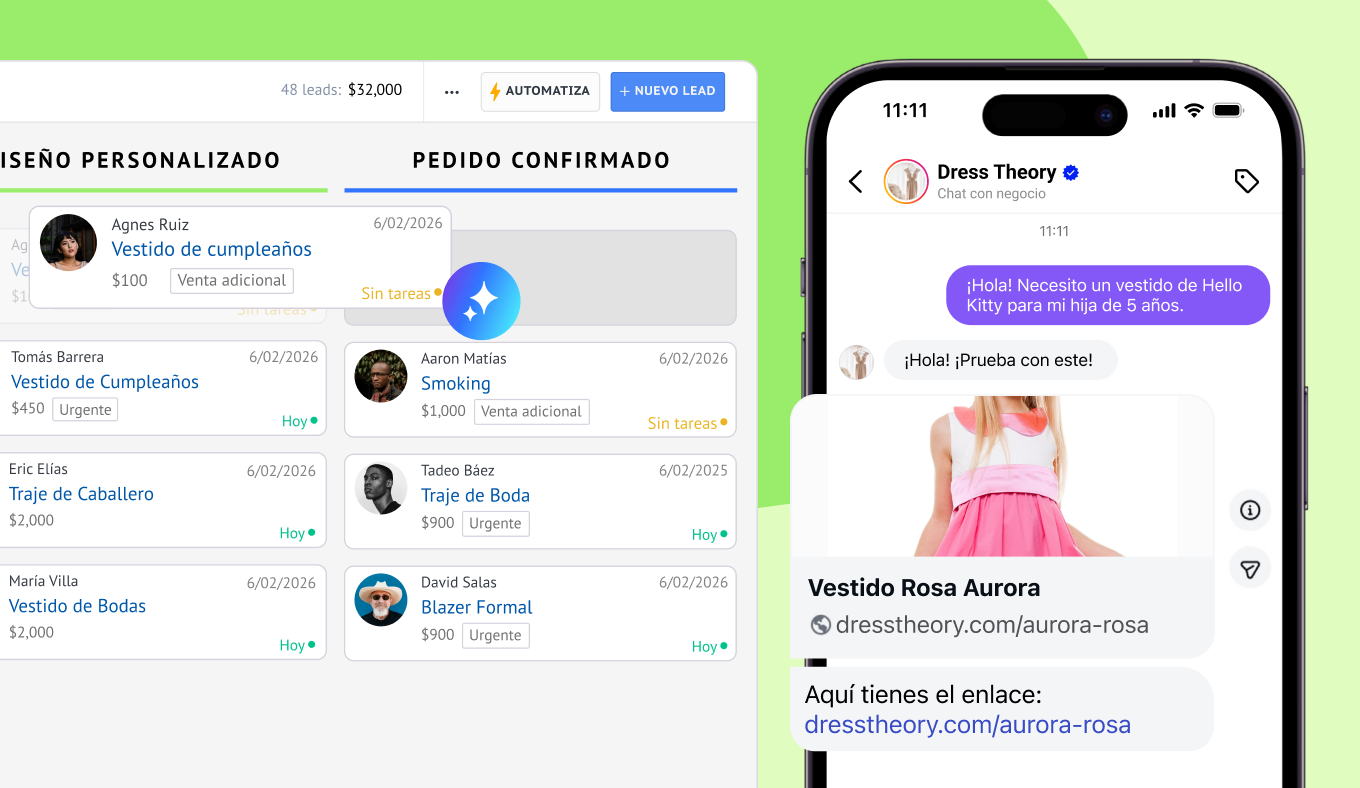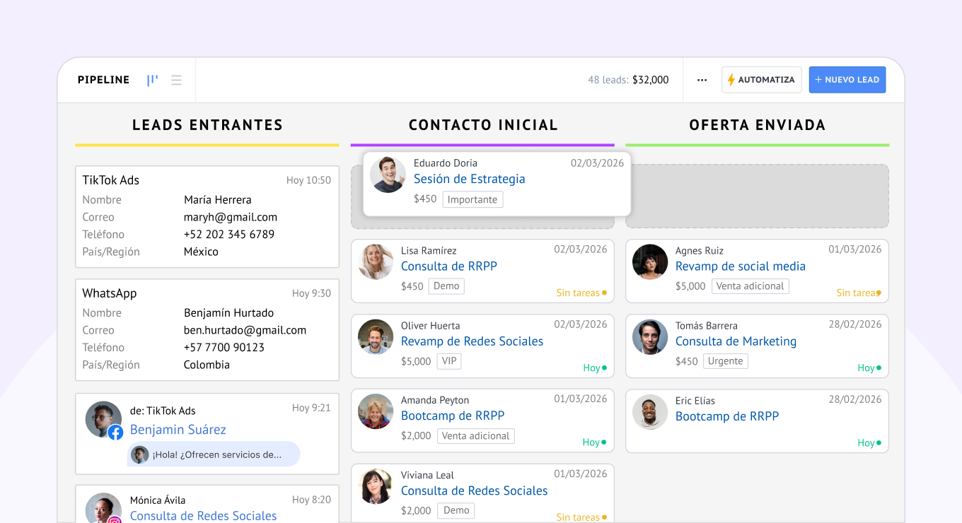 Cada lead y cada conversación se rastrean dentro de un único embudo visual.