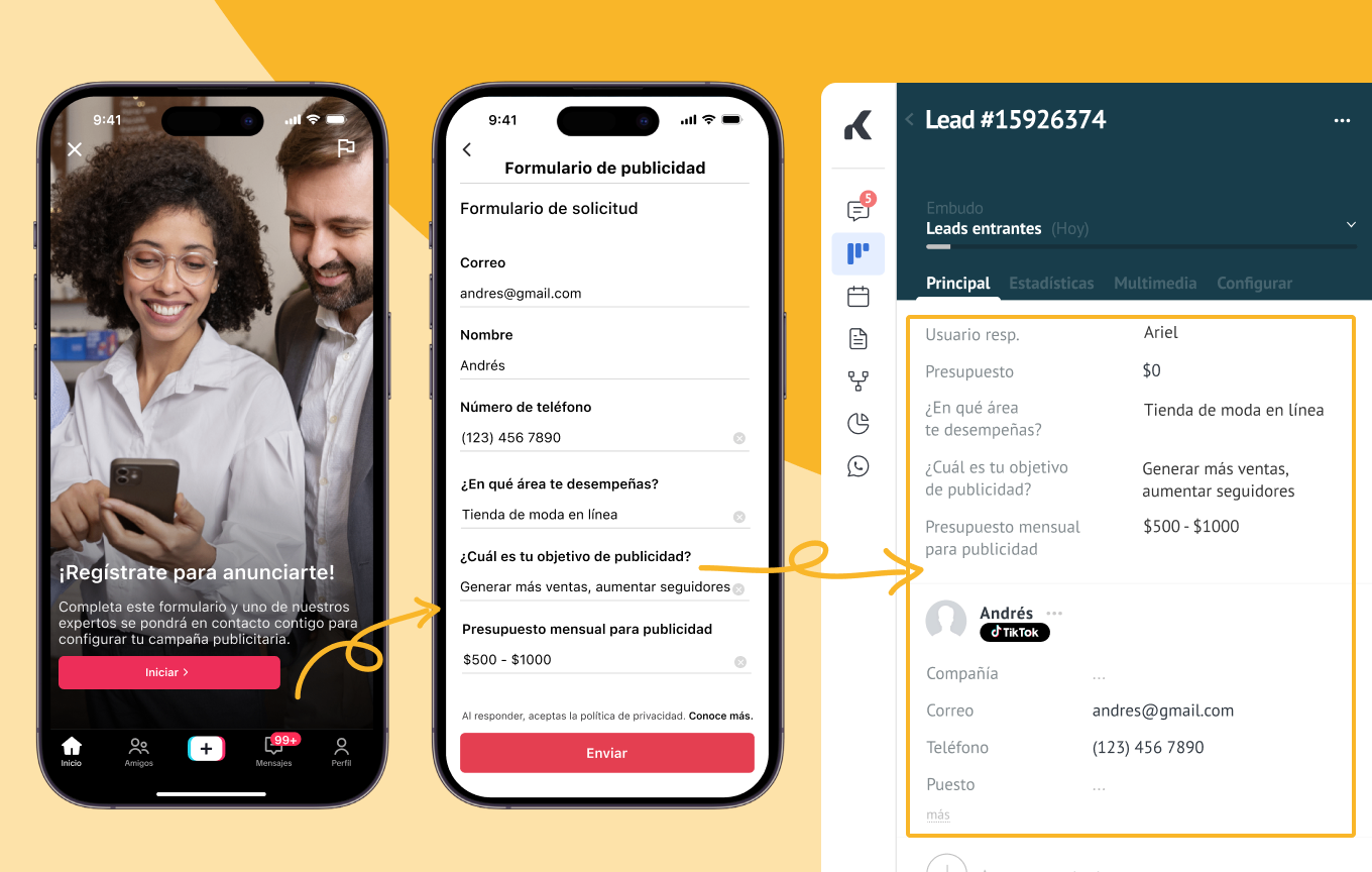 Se conecta con sistemas externos, como Tiktok CRM, para capturar leads de manera eficiente.