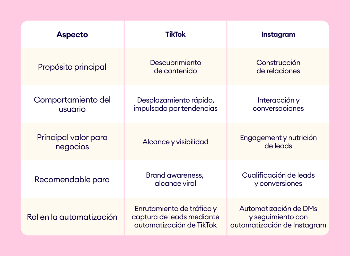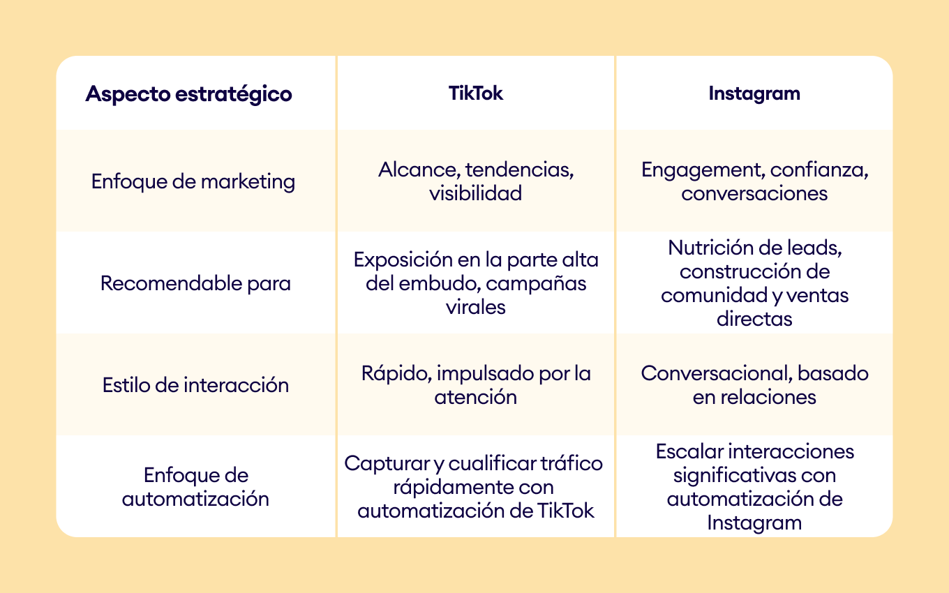 Ambas plataformas permiten automatizaciones similares, pero TikTok prioriza la velocidad y la captura de leads provenientes de tráfico masivo, mientras que Instagram se enfoca en gestionar interacciones y nutrir relaciones a escala.
