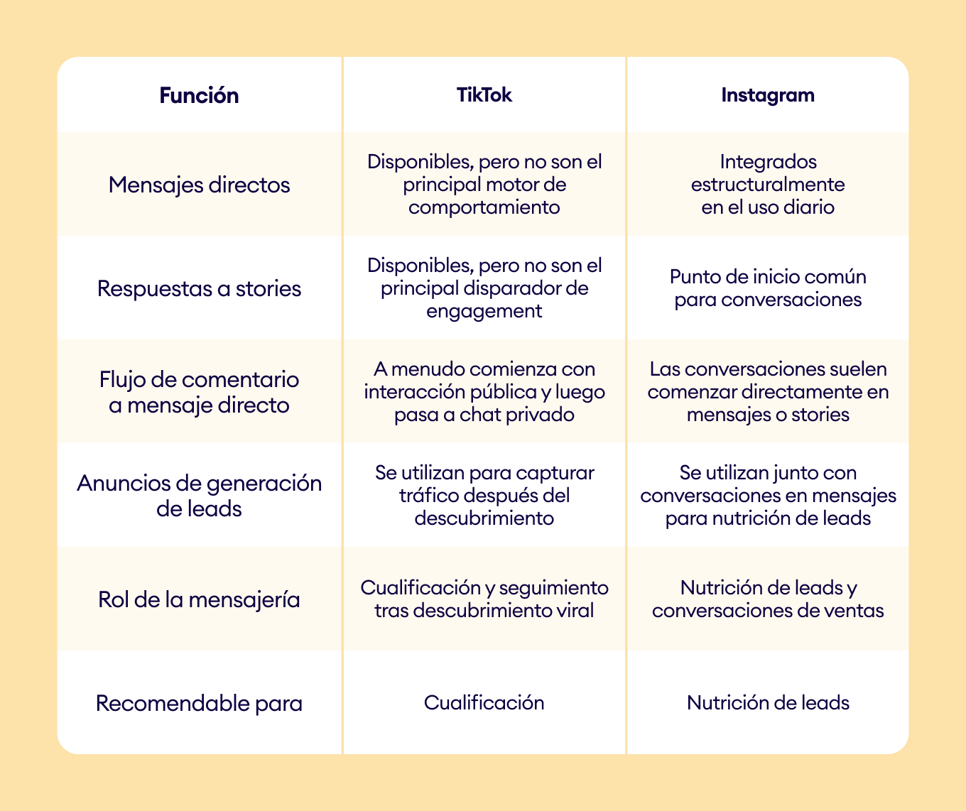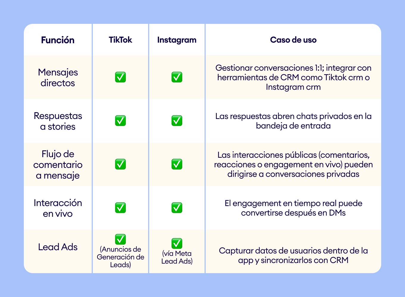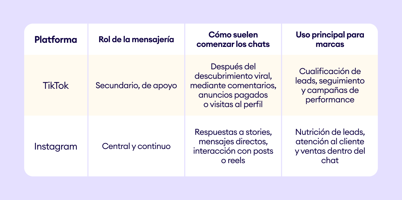 Esta comparación muestra que Instagram vs tiktok no se trata solo de diferentes formatos de contenido; cada plataforma respalda etapas distintas del recorrido del cliente, lo que define cómo las marcas deben abordar la mensajería, la automatización y el engagement.