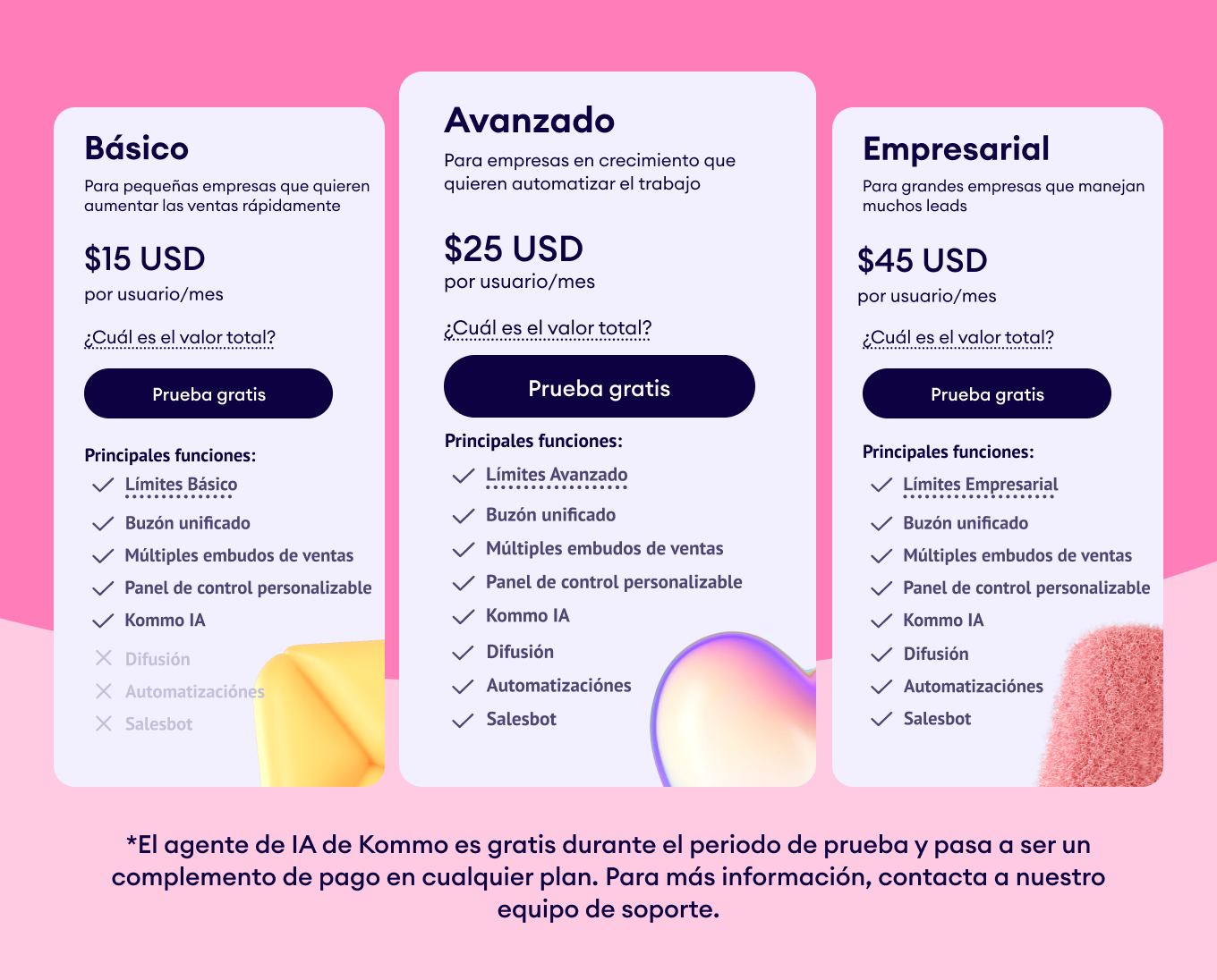 Los precios de Kommo están divididos en tres niveles: el plan Base cuesta alrededor de $15 USD por usuario/mes, el plan Advanced cuesta $25 USD y el plan Enterprise $45 USD. Cada nivel desbloquea más automatización, funciones avanzadas y mayores límites de contactos y campos personalizados.