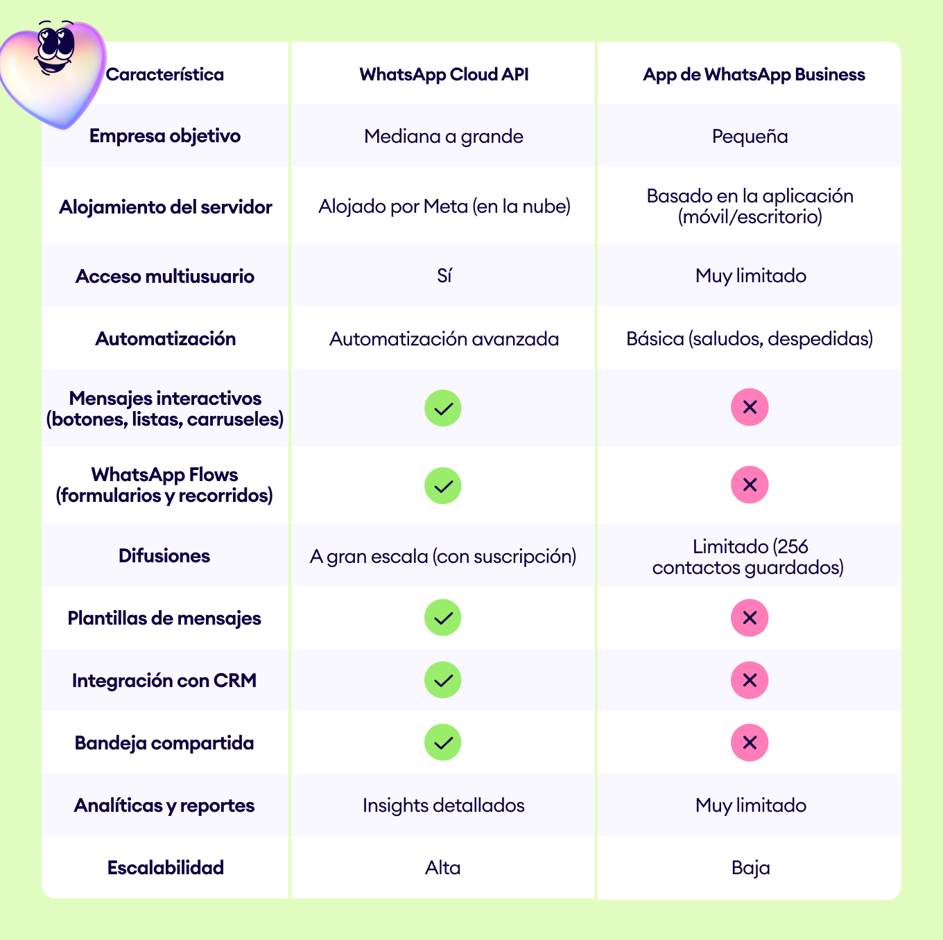 A diferencia de la app básica de WhatsApp Business, WhatsApp Cloud API ofrece la flexibilidad, automatización y herramientas interactivas necesarias para escalar campañas, conectar con clientes de forma efectiva e integrarse sin fricciones con un CRM. Esto la convierte en la base ideal para cualquier software de marketing de WhatsApp orientado al crecimiento.