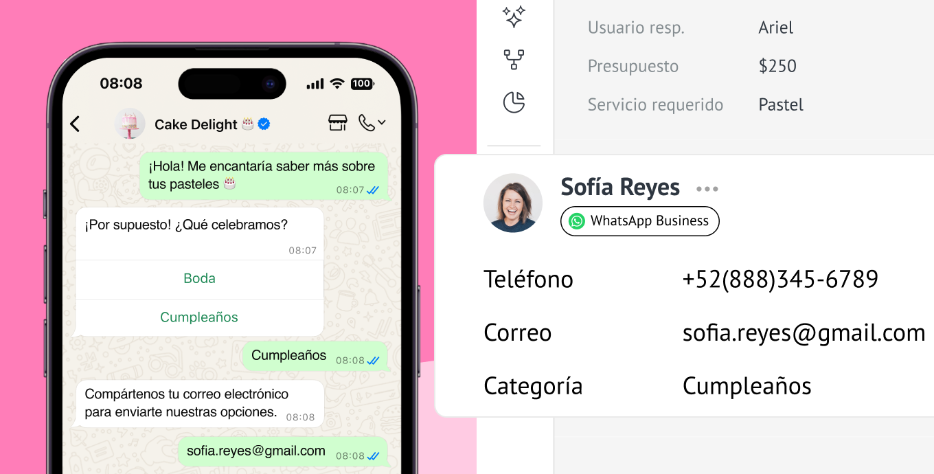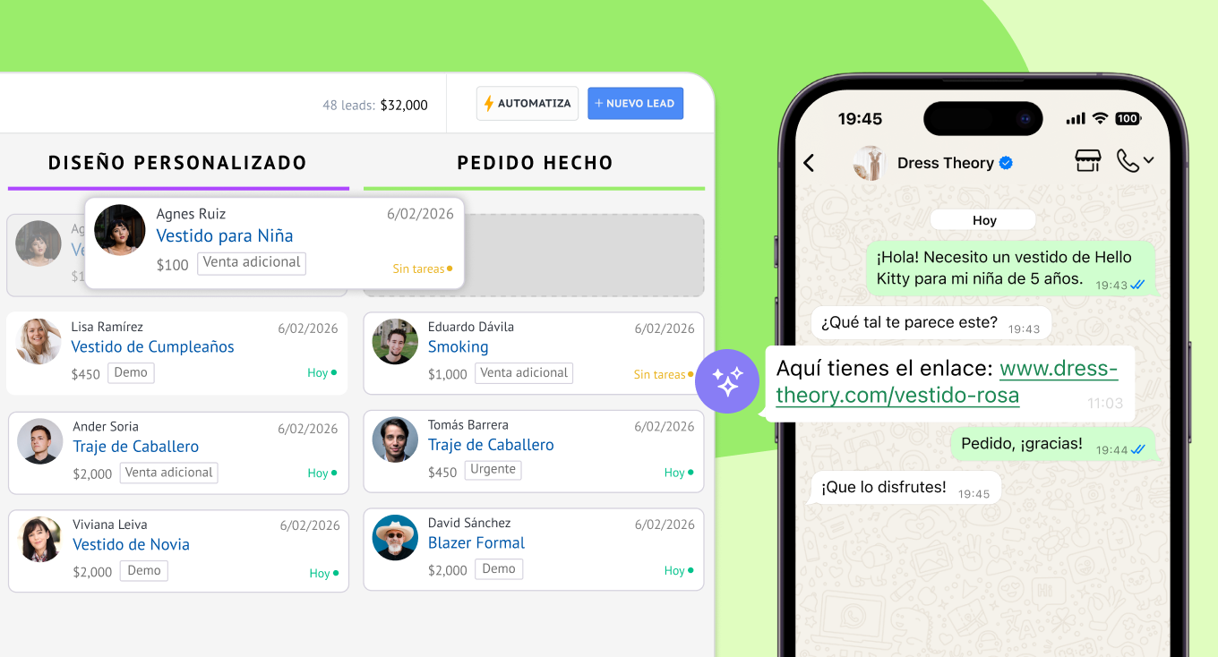 Cada conversación de WhatsApp se convierte automáticamente en una ficha de lead con historial, datos de contacto y seguimiento de actividades, ayudándote a mover prospectos a lo largo del embudo de ventas de forma ordenada y eficiente.