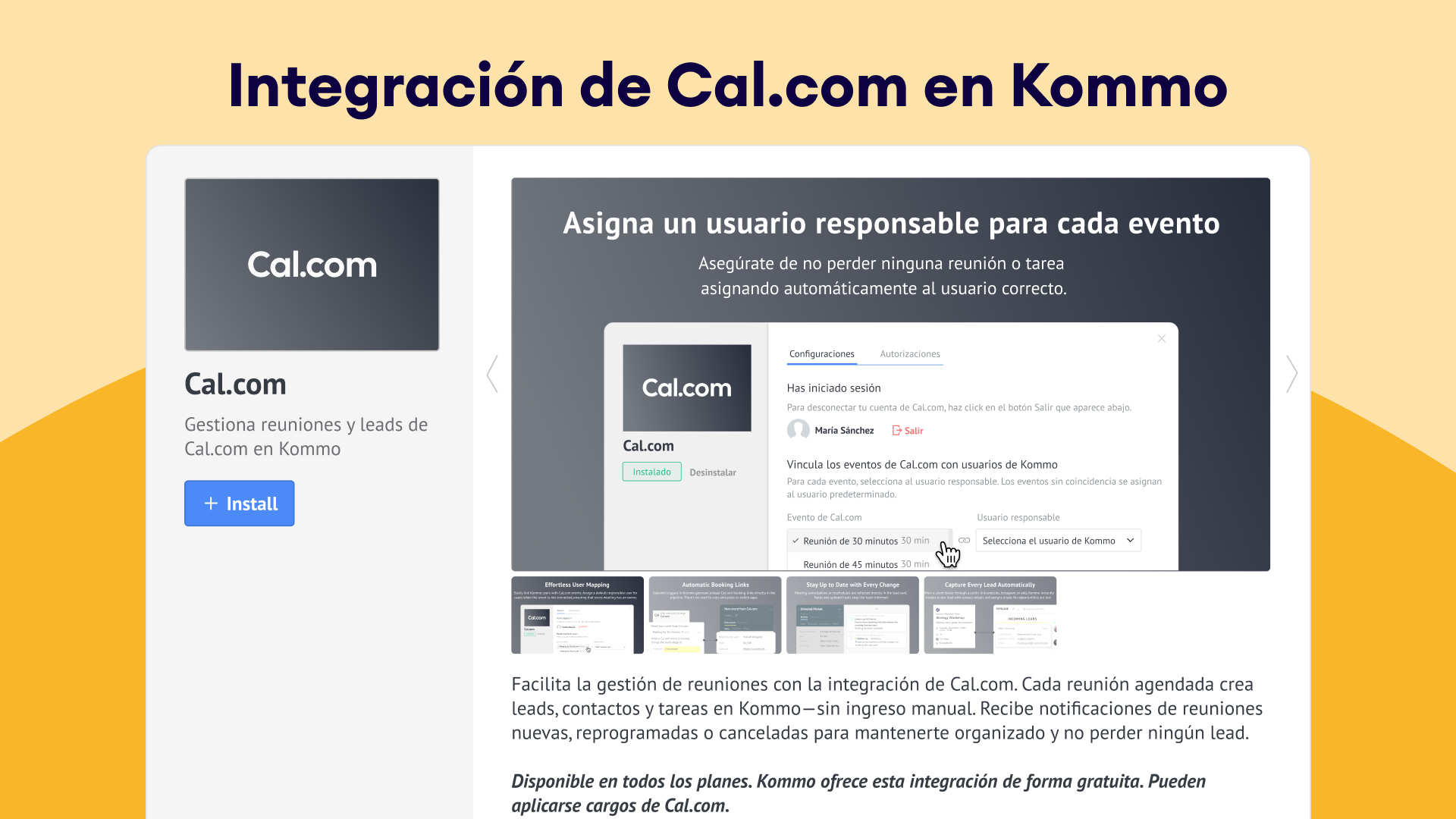 - Agrega Cal.com en Kommo desde Configuración > Integraciones > busca Cal.com > haz clic en Instalar.