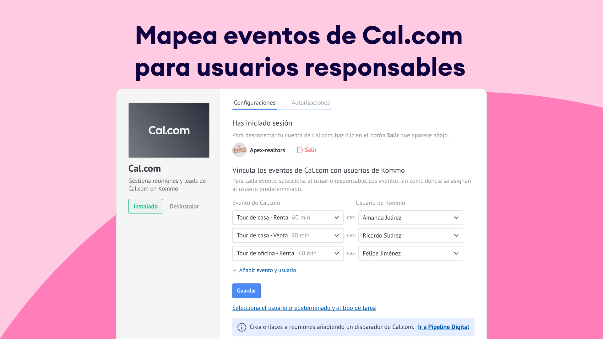 Asignación de eventos a usuarios: asigna eventos específicos de Cal.com a usuarios de Kommo, para que cada cita tenga un responsable.