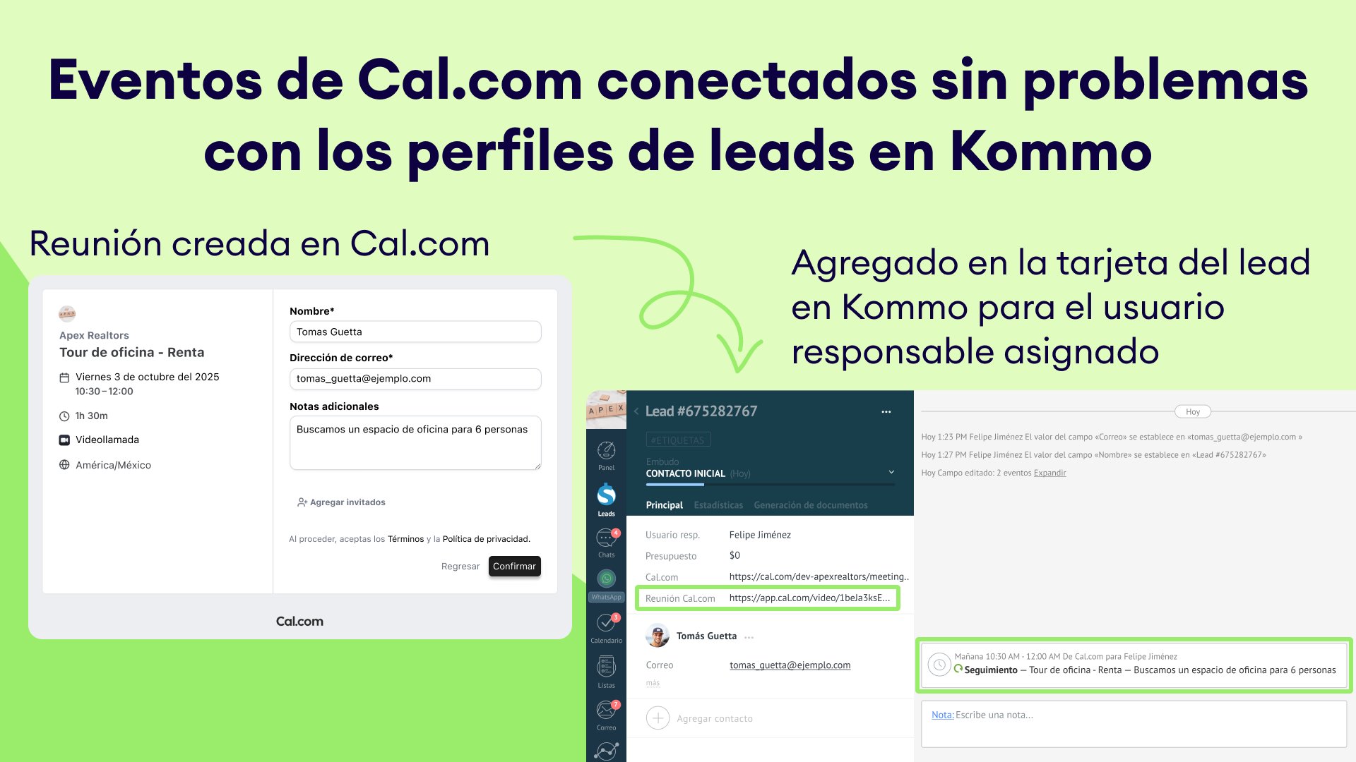 Con Cal.com conectado a Kommo, agendar reuniones se vuelve algo fácil y totalmente integrado. Aquí tienes algunas maneras de aprovechar al máximo esta integración:
