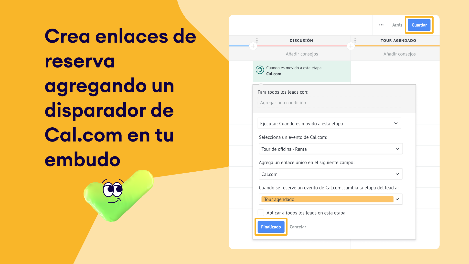 Flujos de trabajo basados en triggers: genera automáticamente enlaces de reserva personalizados para los leads cuando ingresan a una etapa específica del embudo.