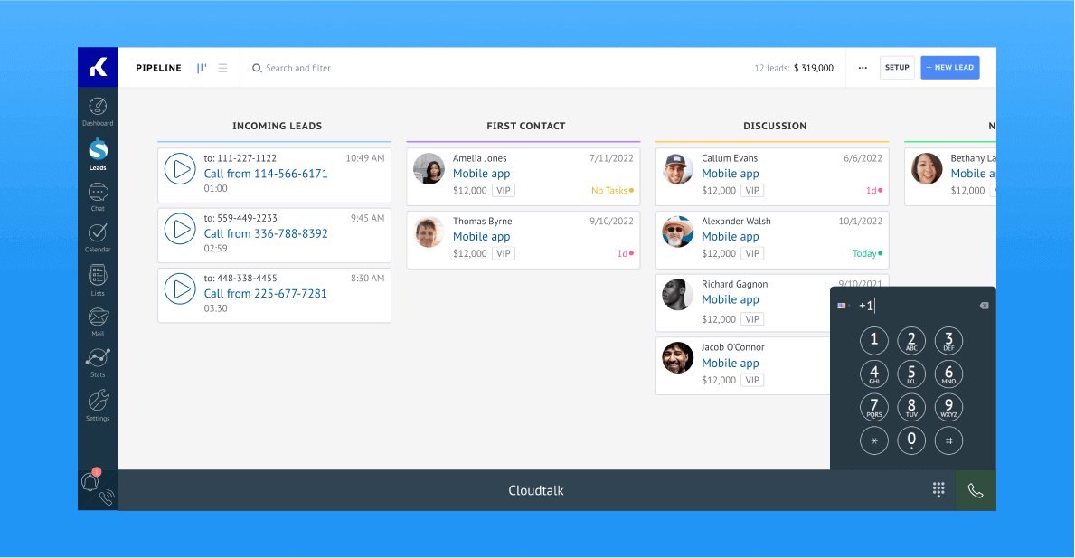 Cloudtalk es una integración que permite mantener el contacto con los clientes dentro de Kommo. Registra todas sus conversaciones telefónicas y la información sobre ellas se almacena dentro de las tarjetas de lead.