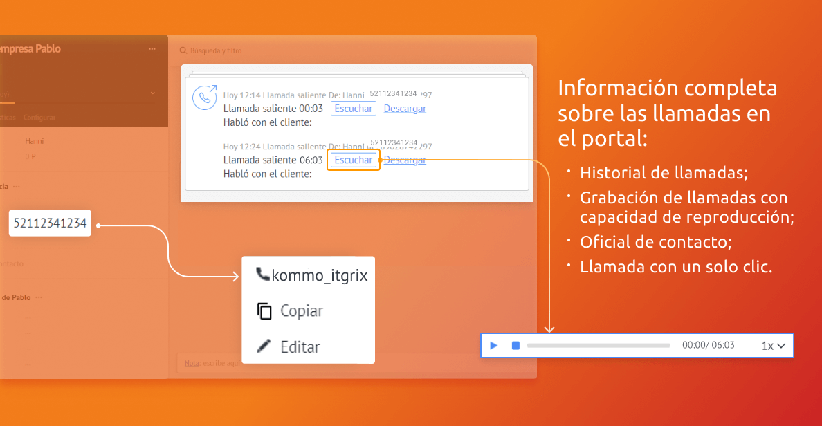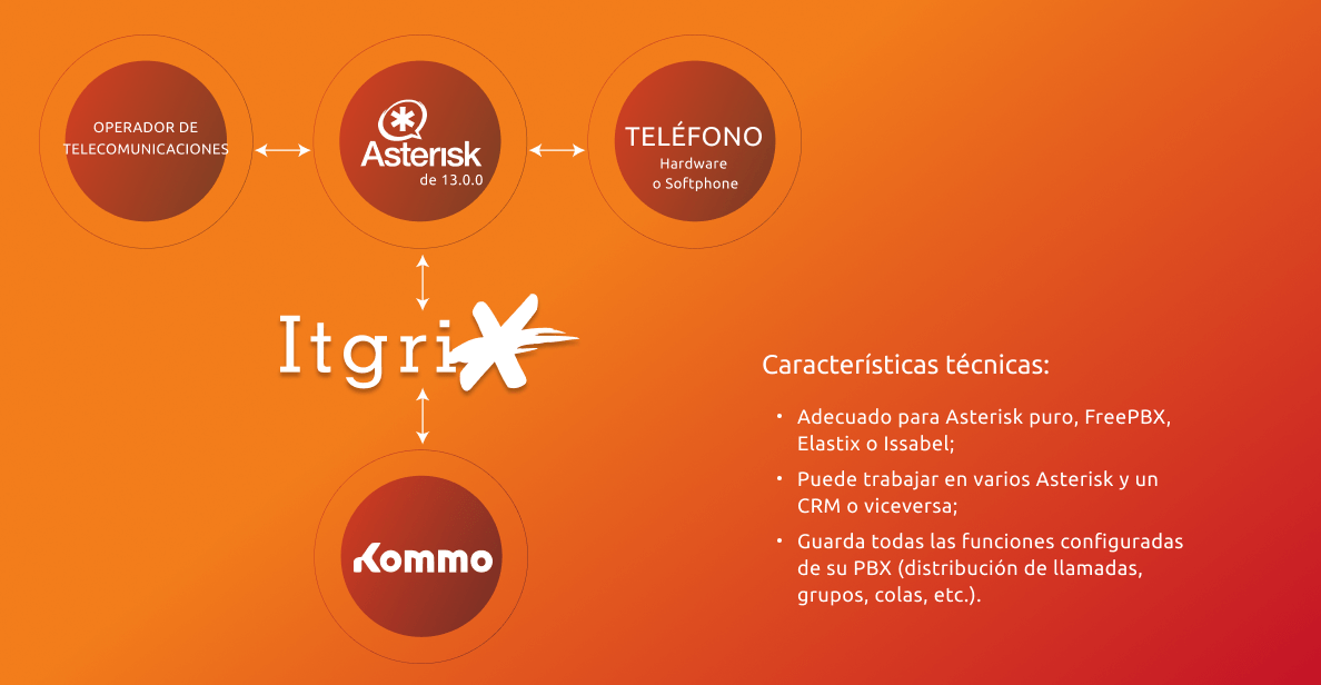 Itgrix es una herramienta confiable para integrar la telefonía Asterisk con Kommo CRM. Proporciona grabación automática de llamadas y llamadas con un solo clic desde una tarjeta de contacto. Esto brinda a los usuarios una poderosa sinergia entre los dos sistemas. Las ventajas de Itgrix ya han sido apreciadas en 22 países y por más de quinientas empresas en todo el mundo.