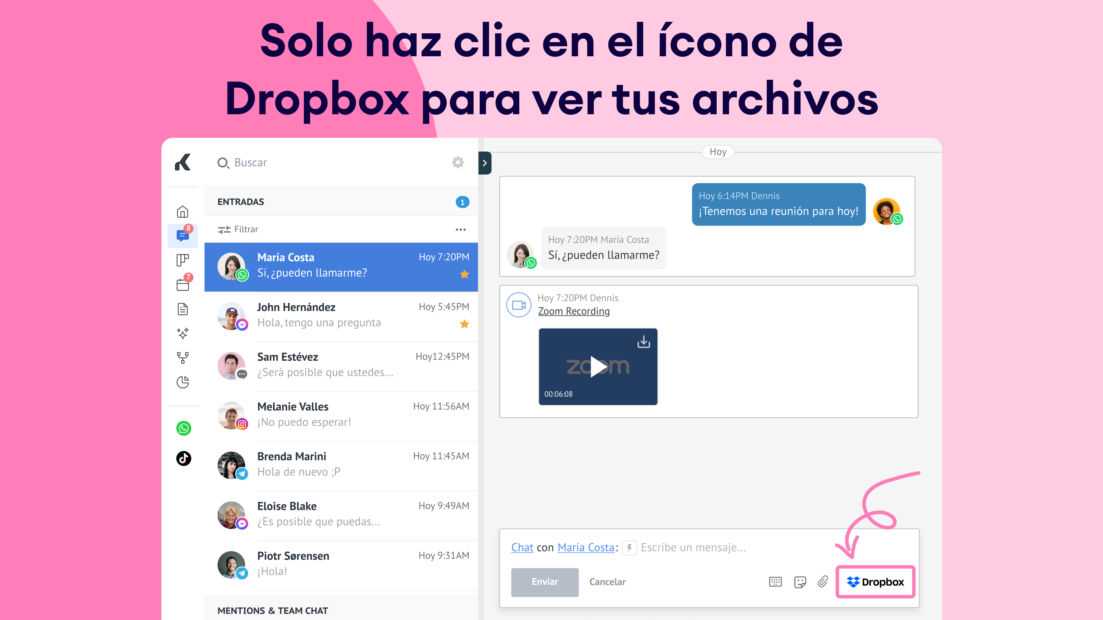 • Acceder a archivos: Abre y visualiza archivos de Dropbox directamente dentro de Kommo, agilizando tu flujo de trabajo sin necesidad de cambiar de aplicación.