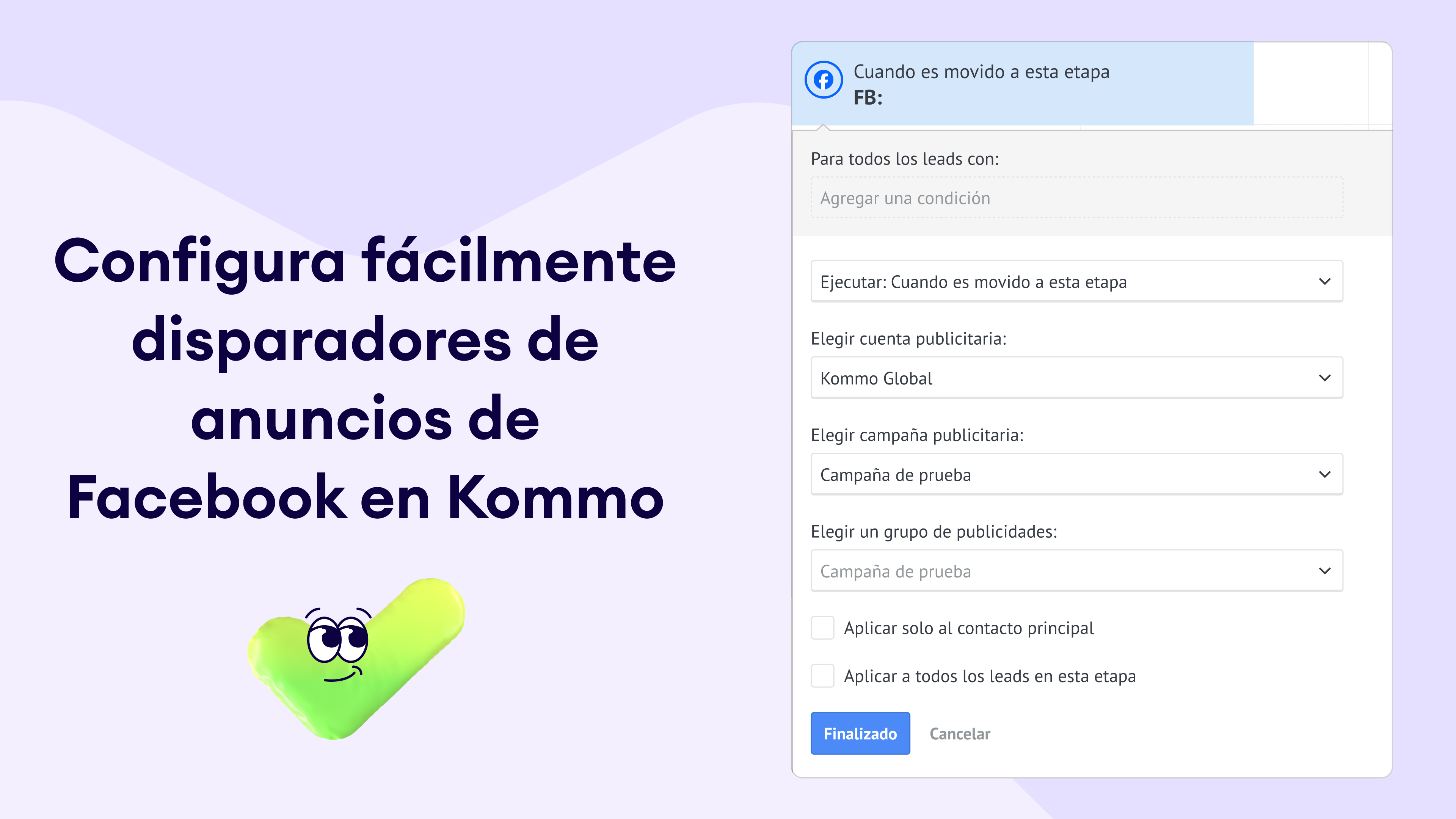 Sincronización de audiencias personalizadas: crea audiencias personalizadas en Facebook directamente desde los disparadores de Kommo a medida que los leads avanzan en tu embudo.