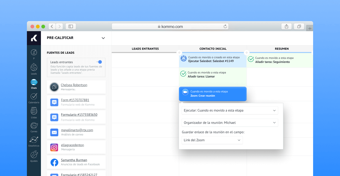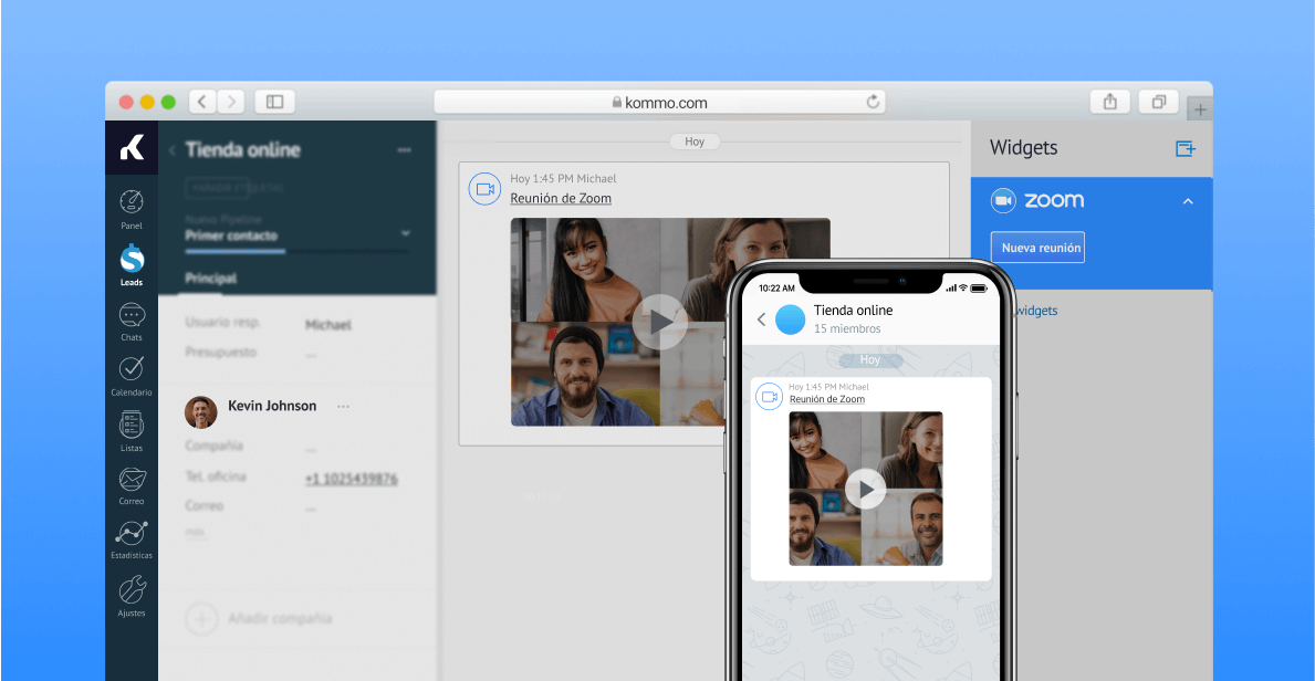 Los usuarios de Kommo adoran Zoom como una fantástica adición a su arsenal de herramientas de ventas que le permite hacer una videollamada con cada lead. Sólo toma unos pocos clics para configurar y ejecutar una reunión en línea que sus leads amarán.