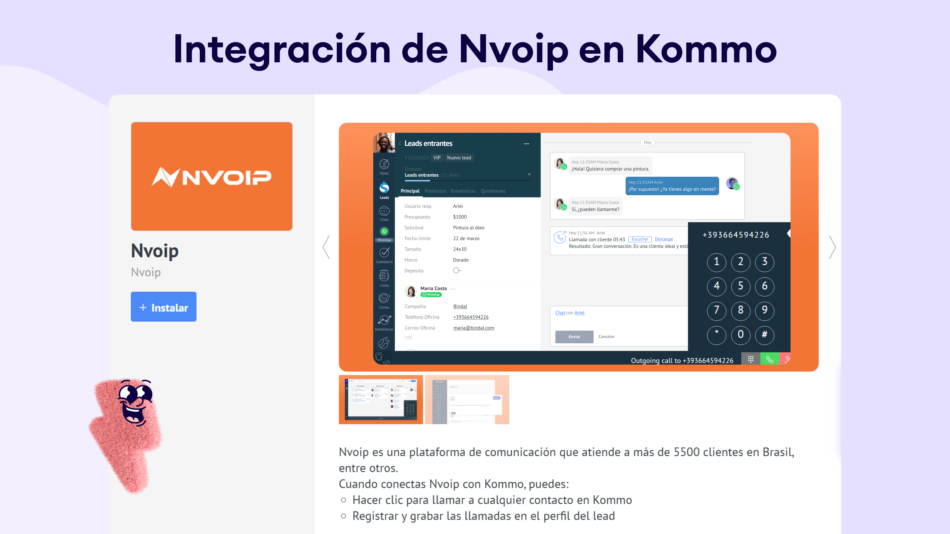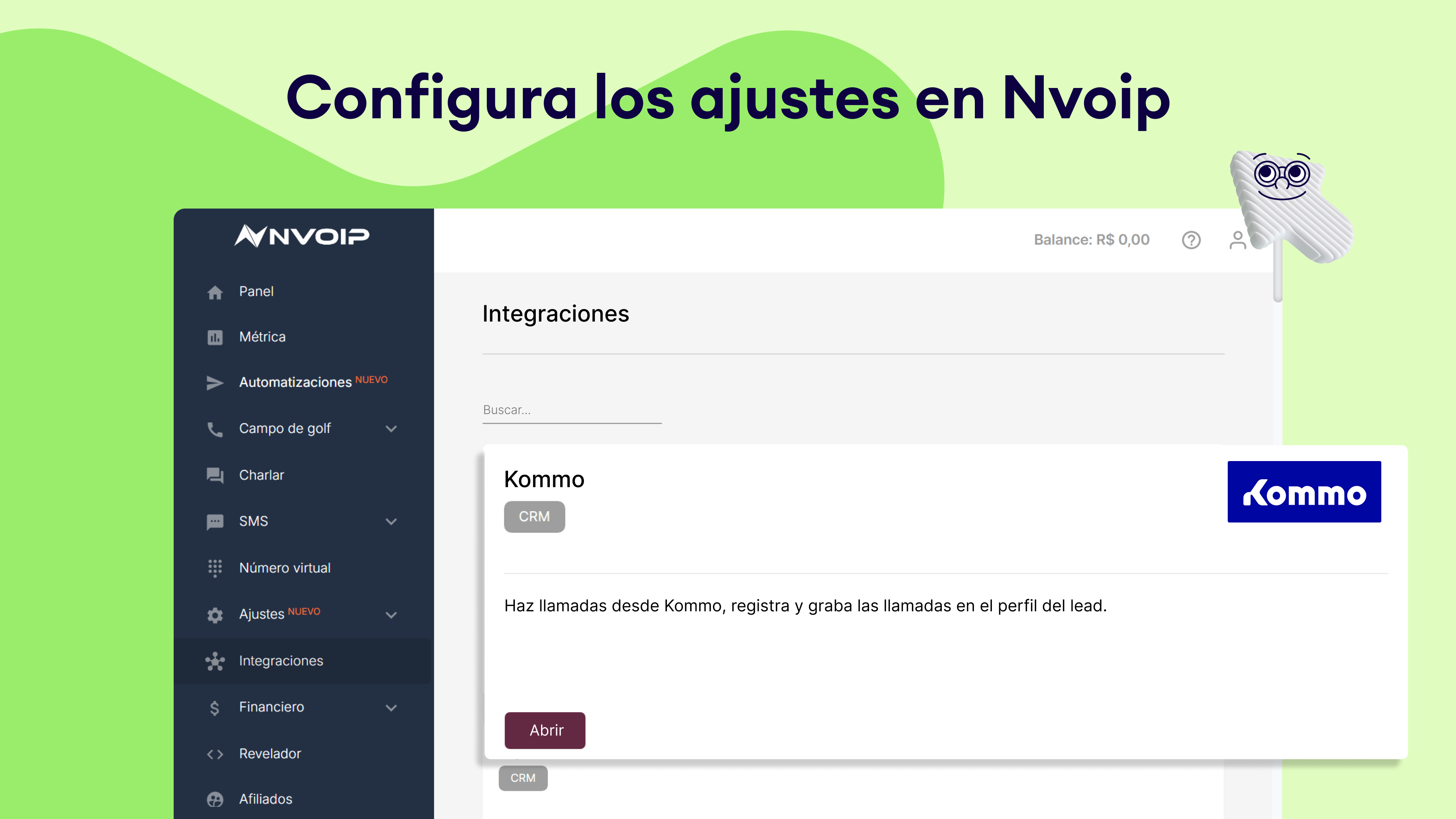 Ve a Ajustes > Integración, busca Nvoip y haz clic en Instalar.