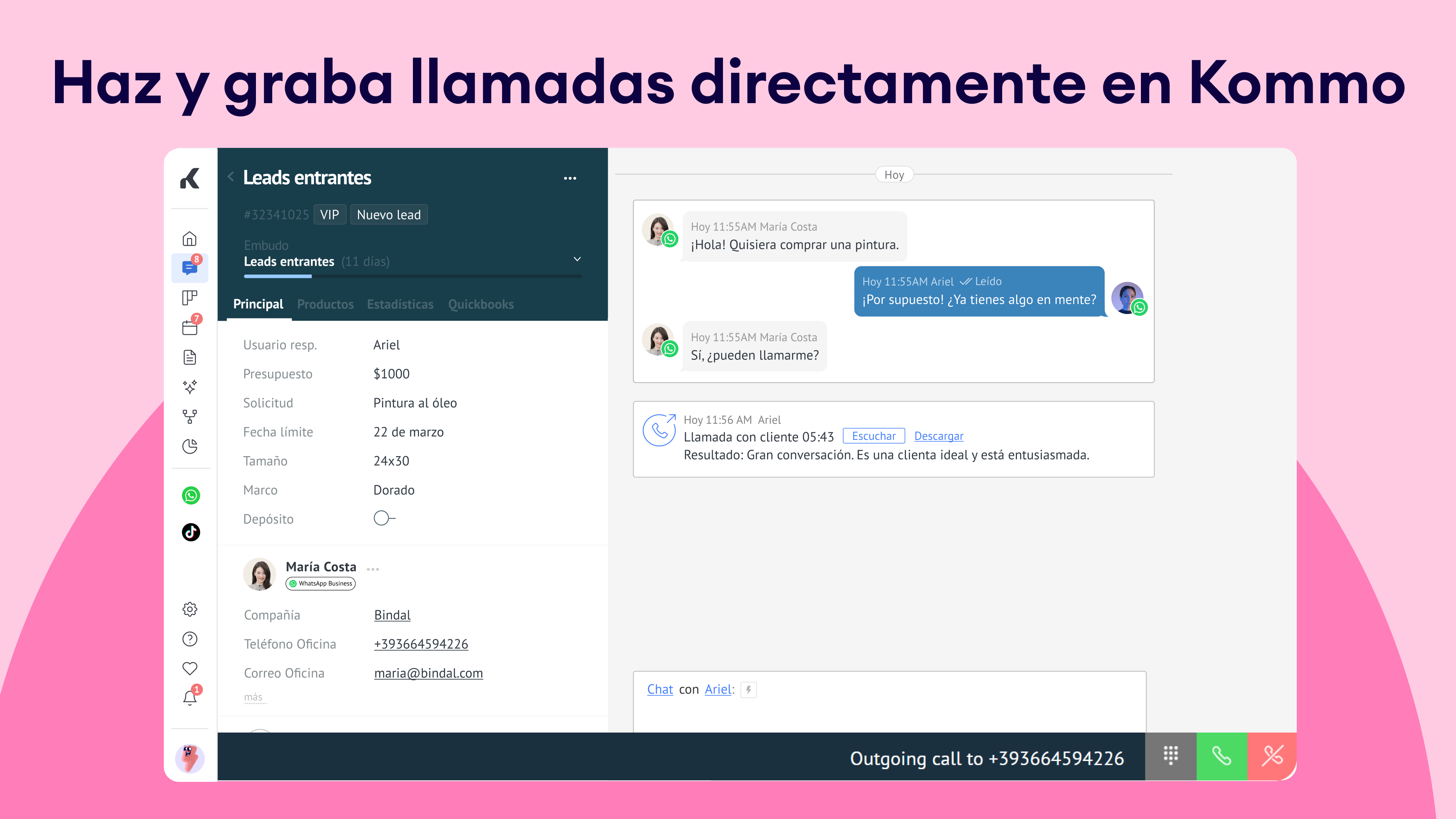Funcionalidad click-to-call: Inicia llamadas directamente desde las tarjetas de leads con un solo clic, ahorrando tiempo y evitando marcar manualmente.