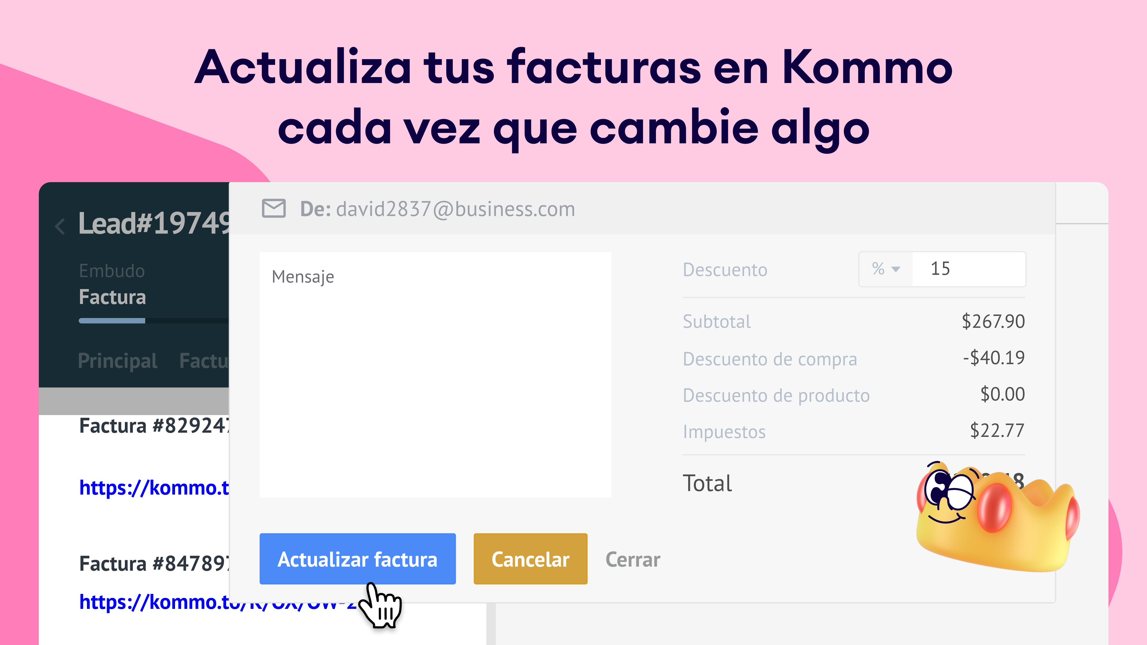 Gestión de facturas: edita, cancela o reenvía facturas pendientes directamente desde Kommo. Mantén toda la información de facturación organizada, precisa y accesible sin depender de múltiples plataformas.