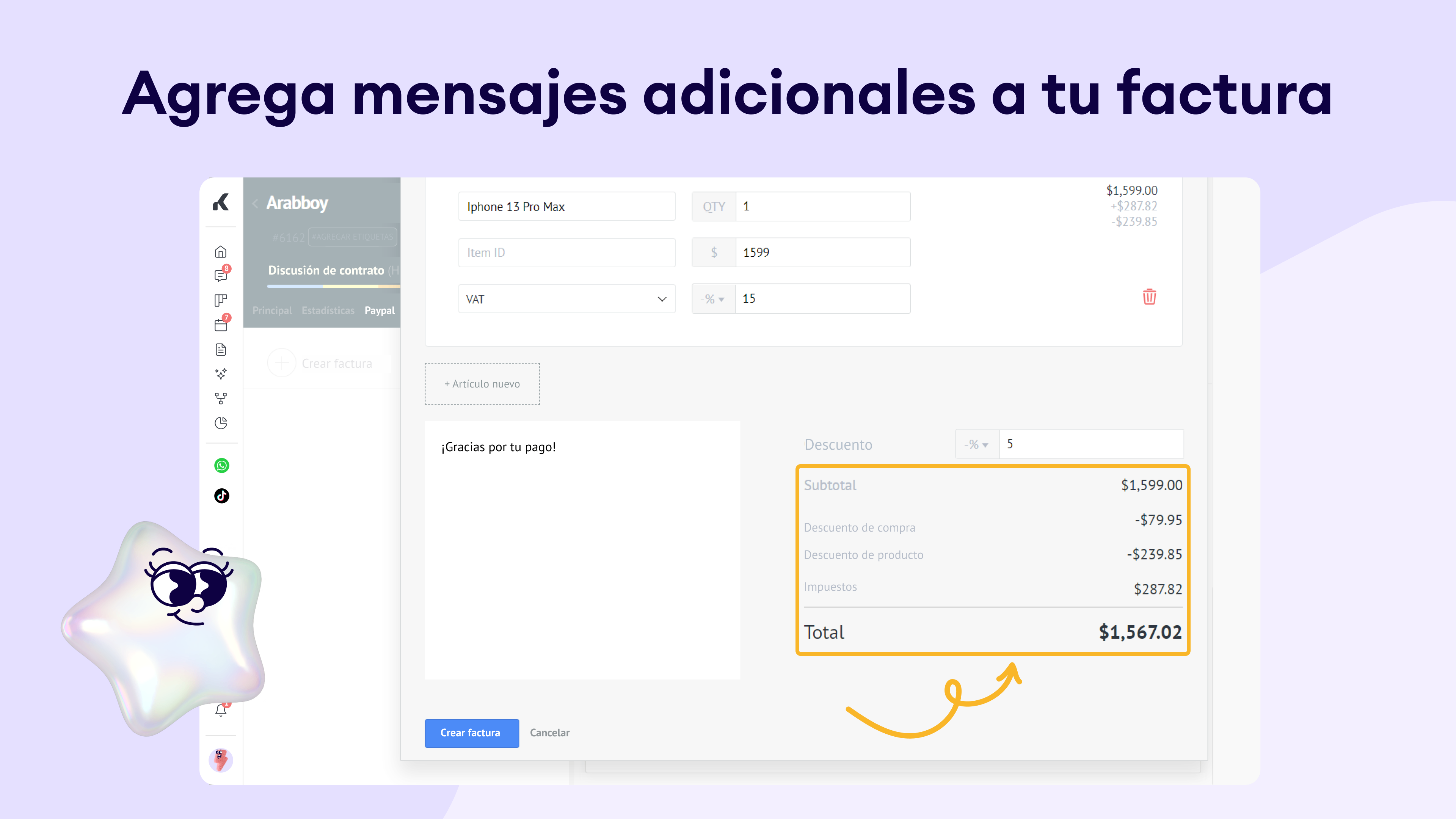 Actualizaciones en tiempo real: cada pago, pago parcial o factura vencida se refleja de inmediato en la tarjeta del lead. Tu equipo siempre tendrá información financiera actualizada sin cambiar de aplicación.
