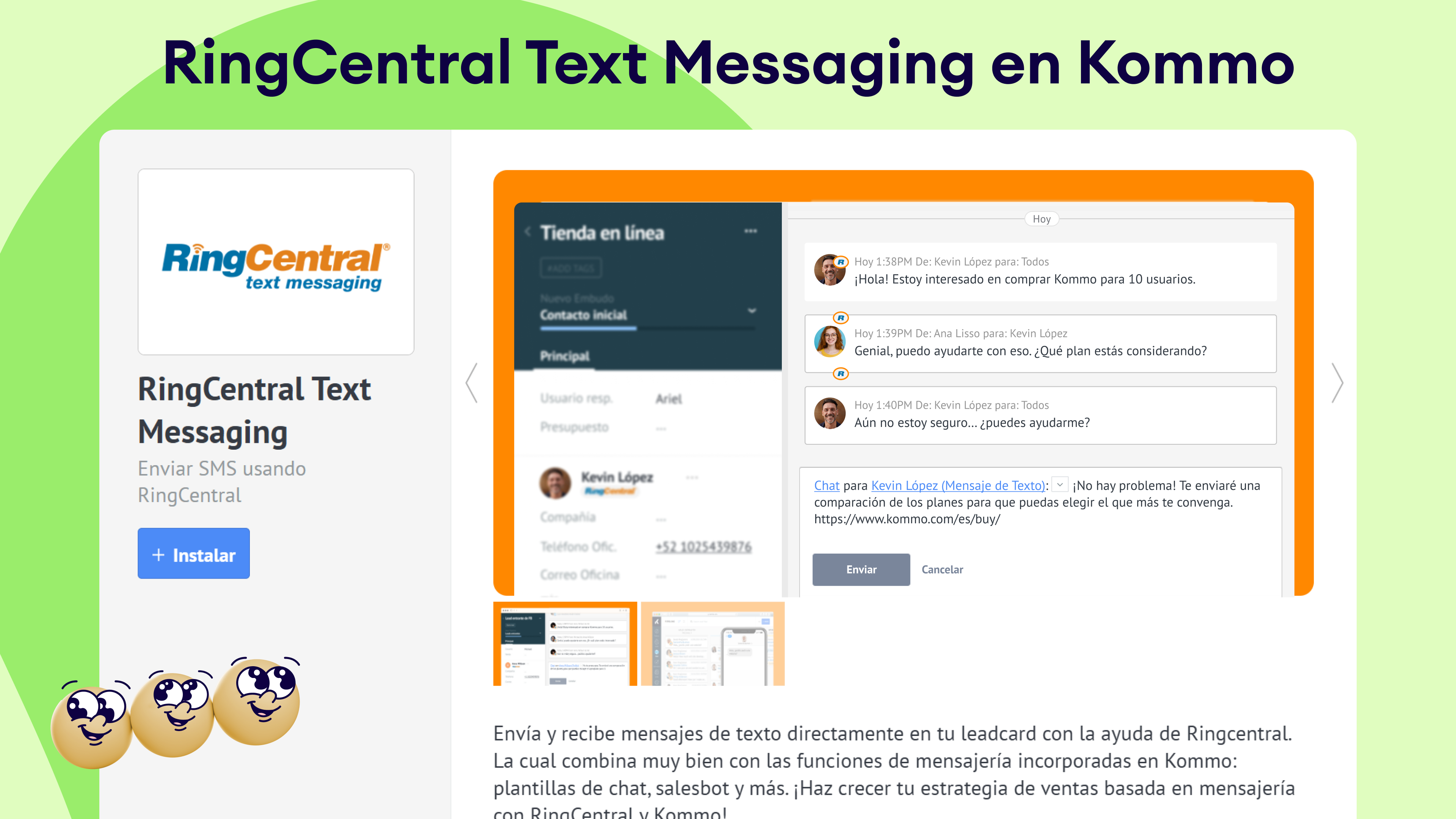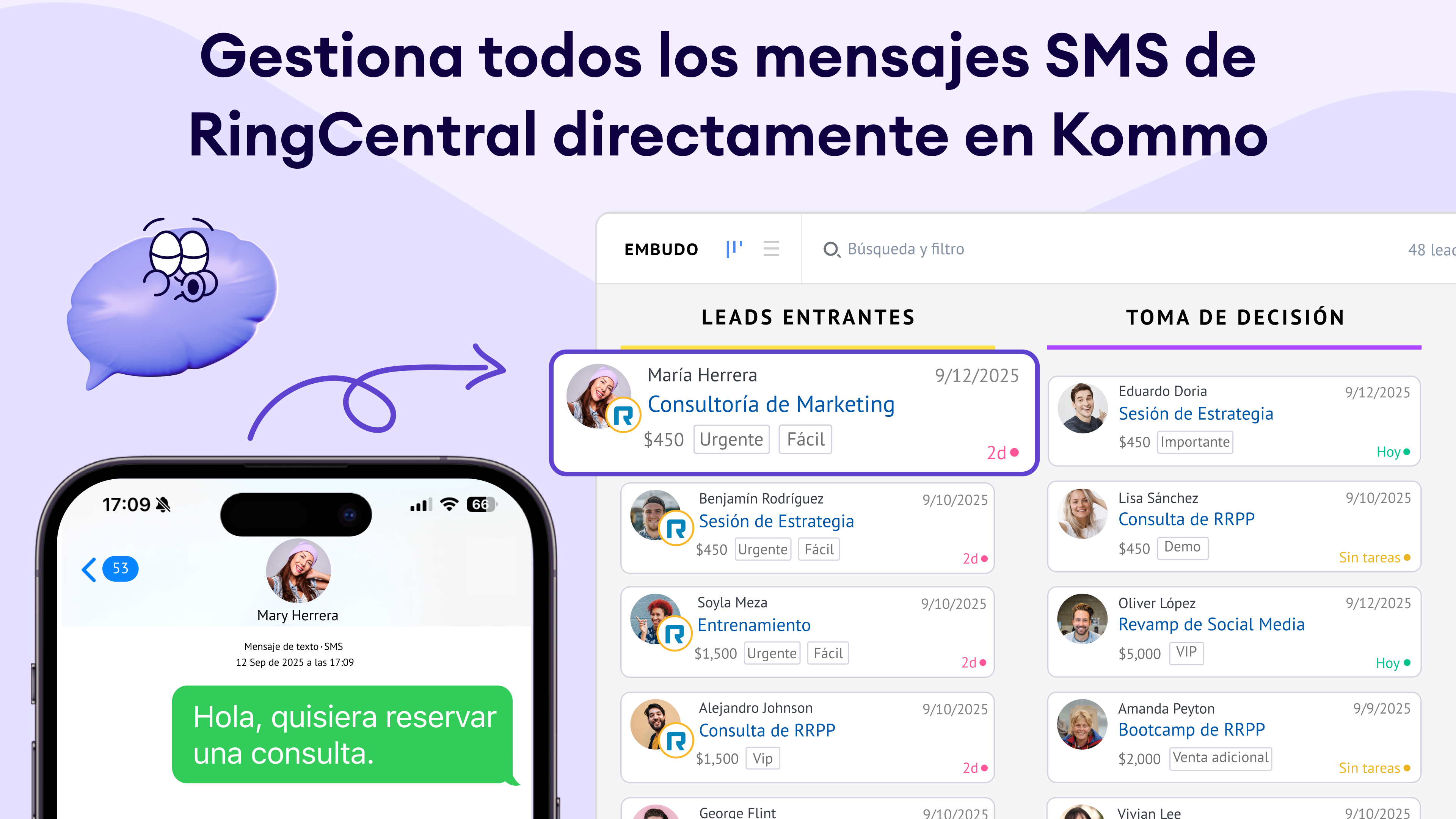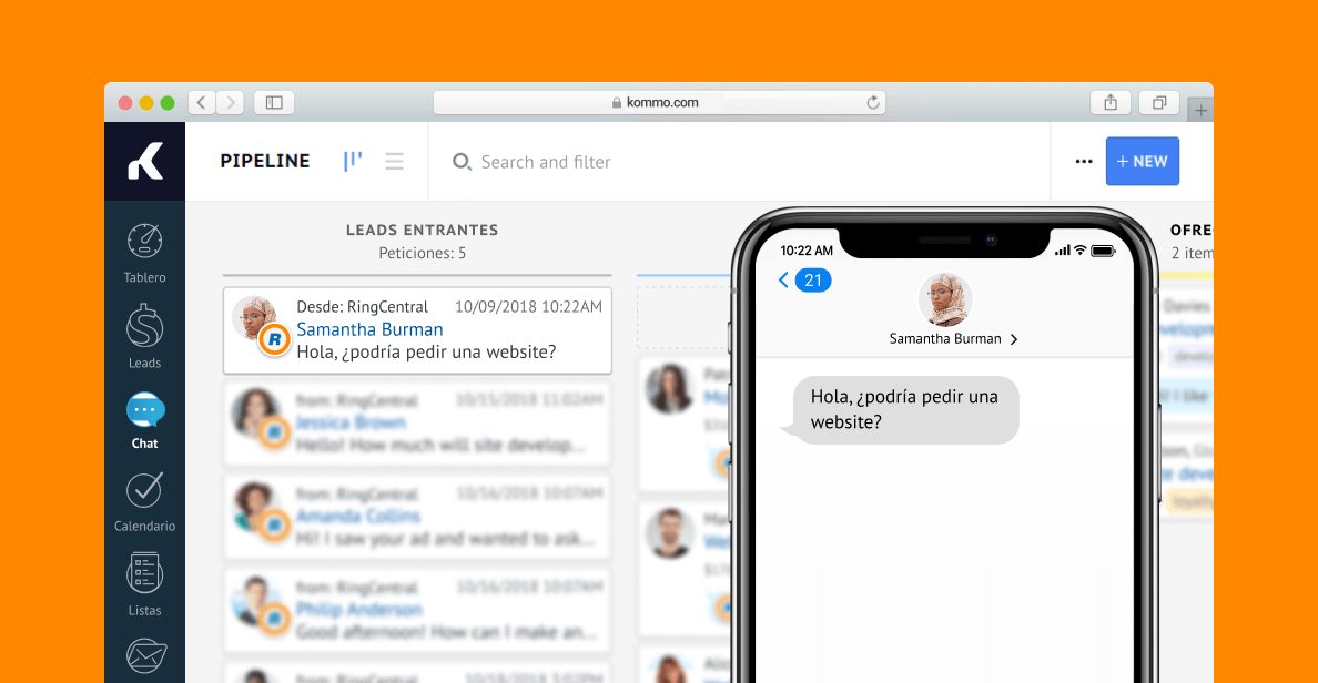 La integración de RingCentral Text Messaging en Kommo te permite enviar y recibir mensajes SMS directamente desde tu CRM. Al conectar RingCentral, puedes automatizar flujos de comunicación, interactuar con leads de manera efectiva y mantener un registro completo de todas las interacciones. Esta integración mejora tu capacidad de llegar a los clientes a través de SMS, asegurando una comunicación oportuna y personalizada.