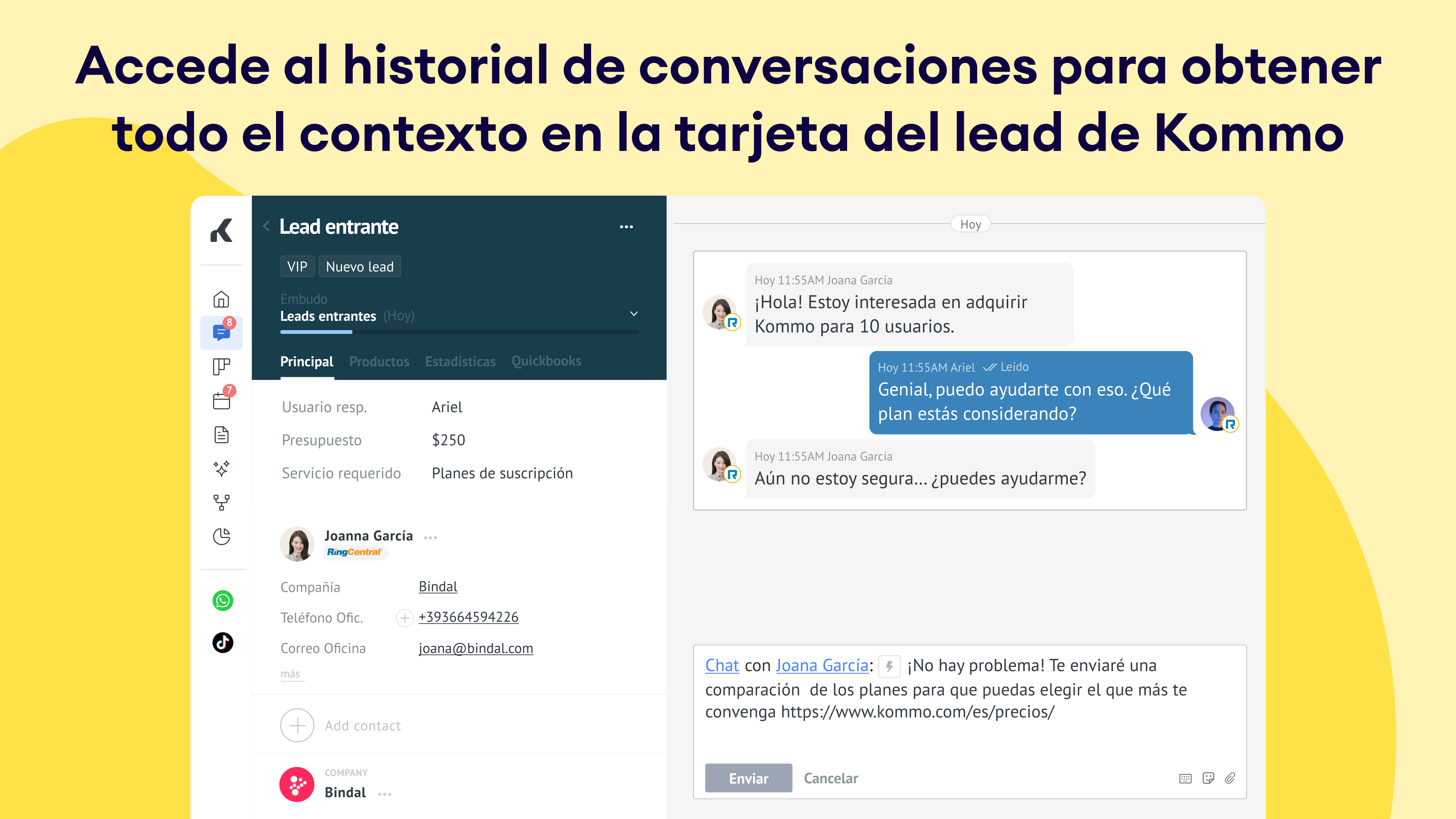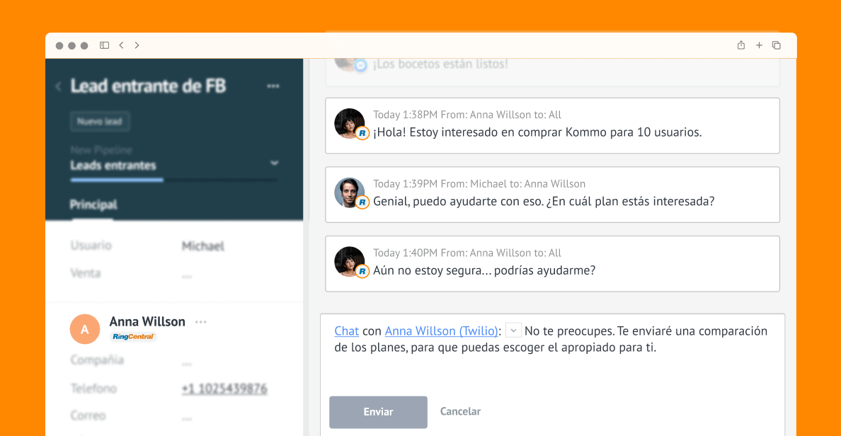 Seguimiento completo: Todos los mensajes enviados y recibidos se registran automáticamente en la tarjeta del lead, brindando un historial de comunicación completo.