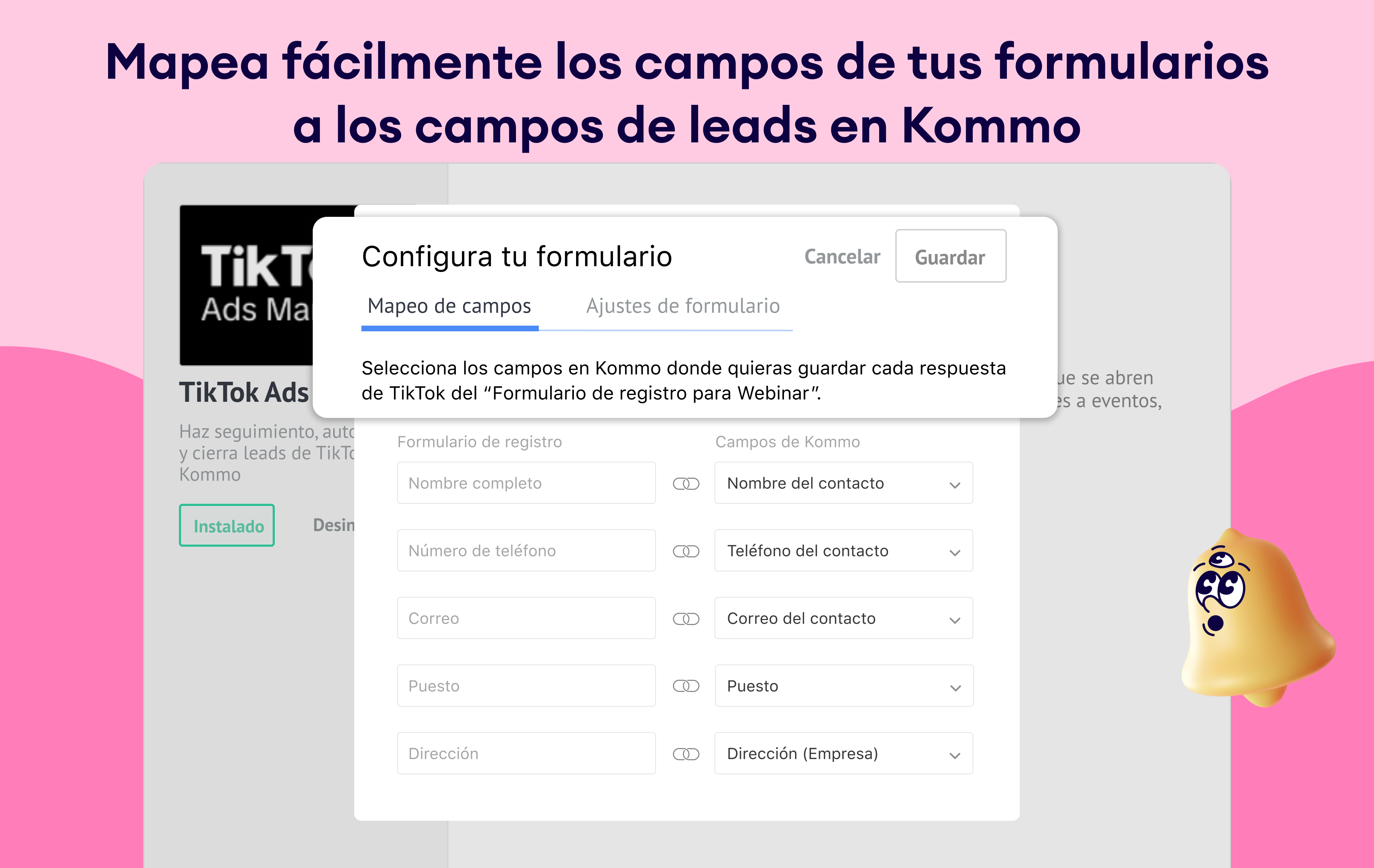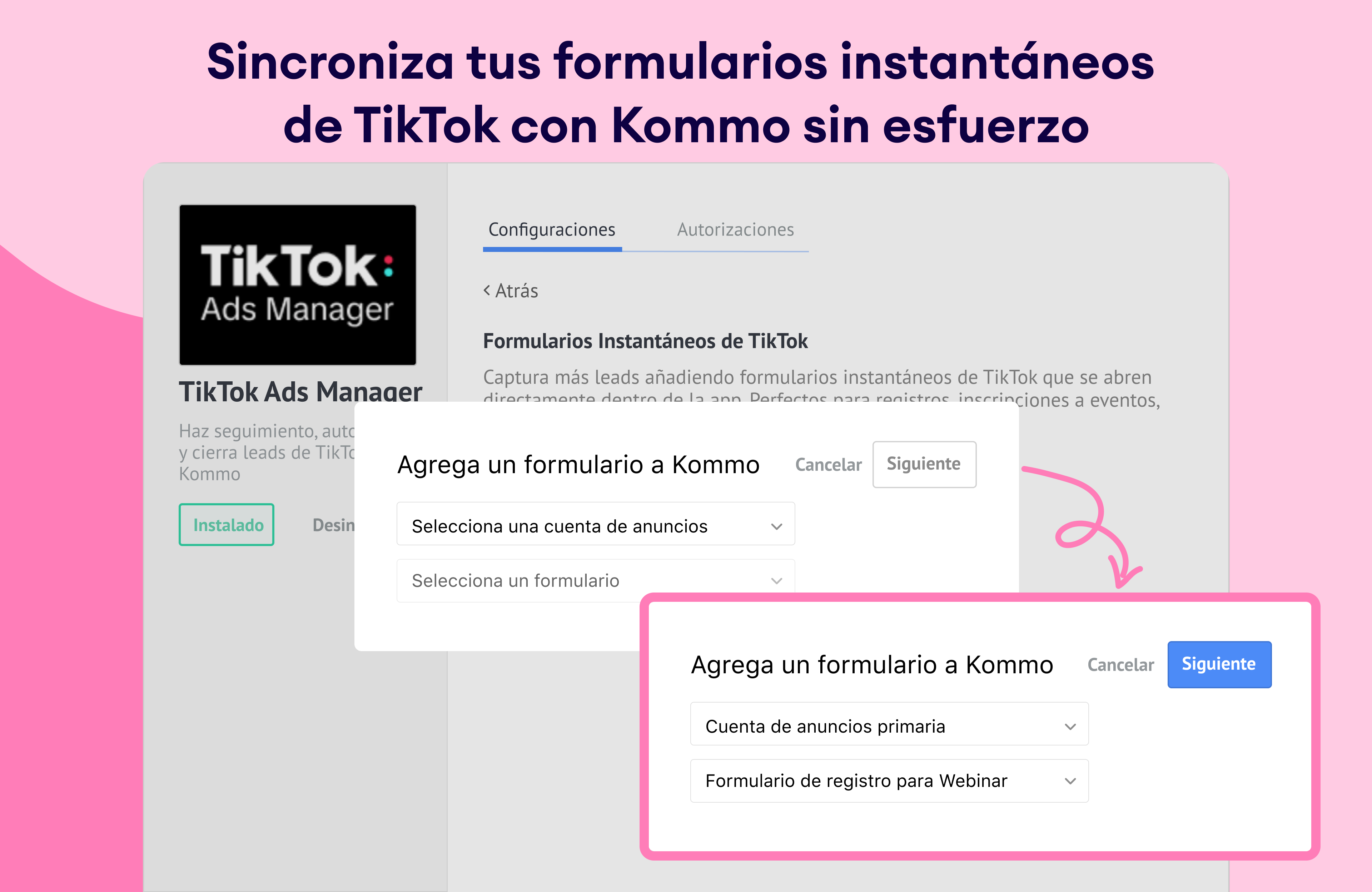 Agrega Formularios instantáneos de TikTok seleccionando la cuenta, mapeando los campos del formulario con los de Kommo y asignando etiquetas o etapas del embudo.