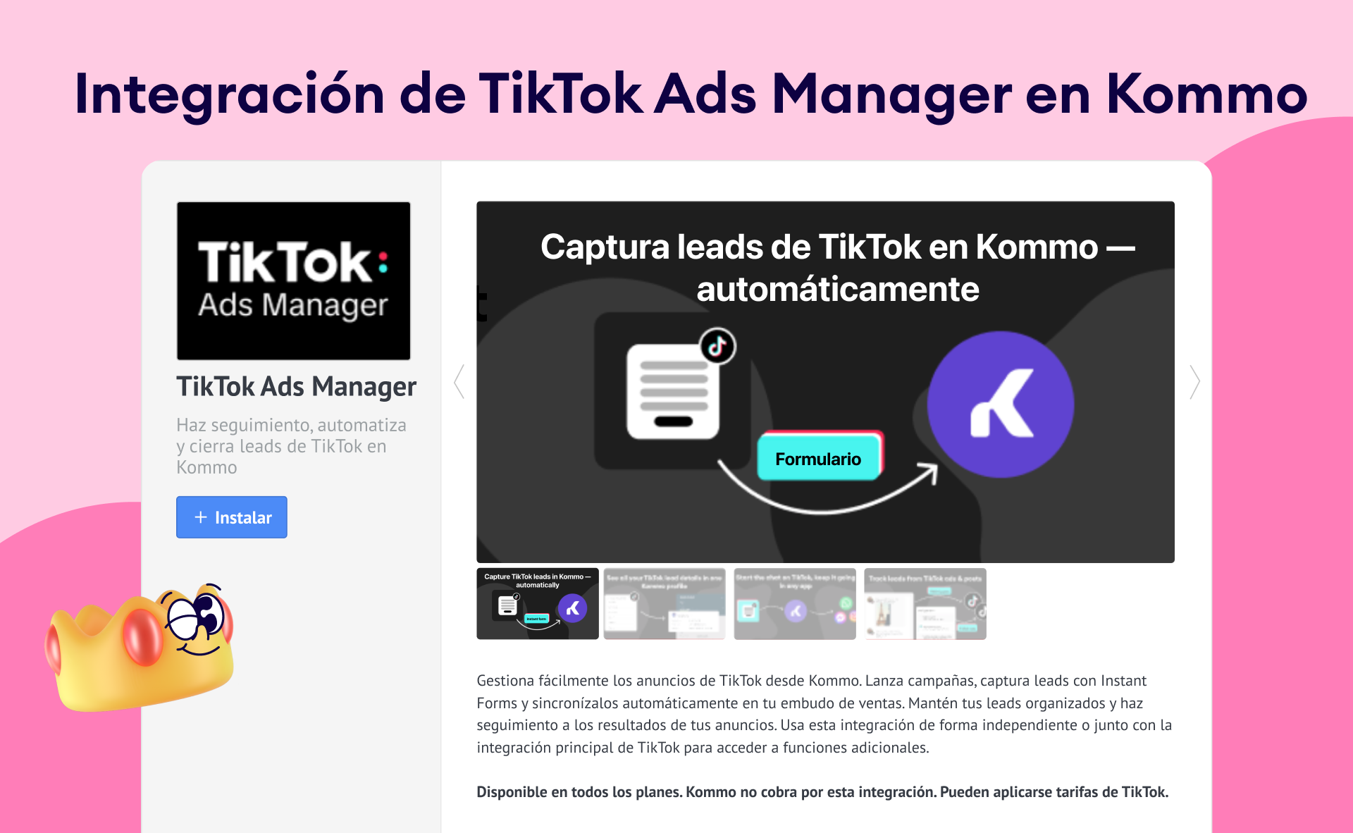 Los usuarios valoran esta integración porque convierte las campañas publicitarias de TikTok en un flujo de generación de leads totalmente automatizado. Con etiquetado asistido por IA, gestión de embudos y herramientas de comunicación unificada, los leads fluyen directamente a Kommo y pueden ser contactados al instante. Esto permite capturar prospectos de manera eficiente, dar seguimiento más rápido y sacar el máximo provecho de la publicidad en TikTok.