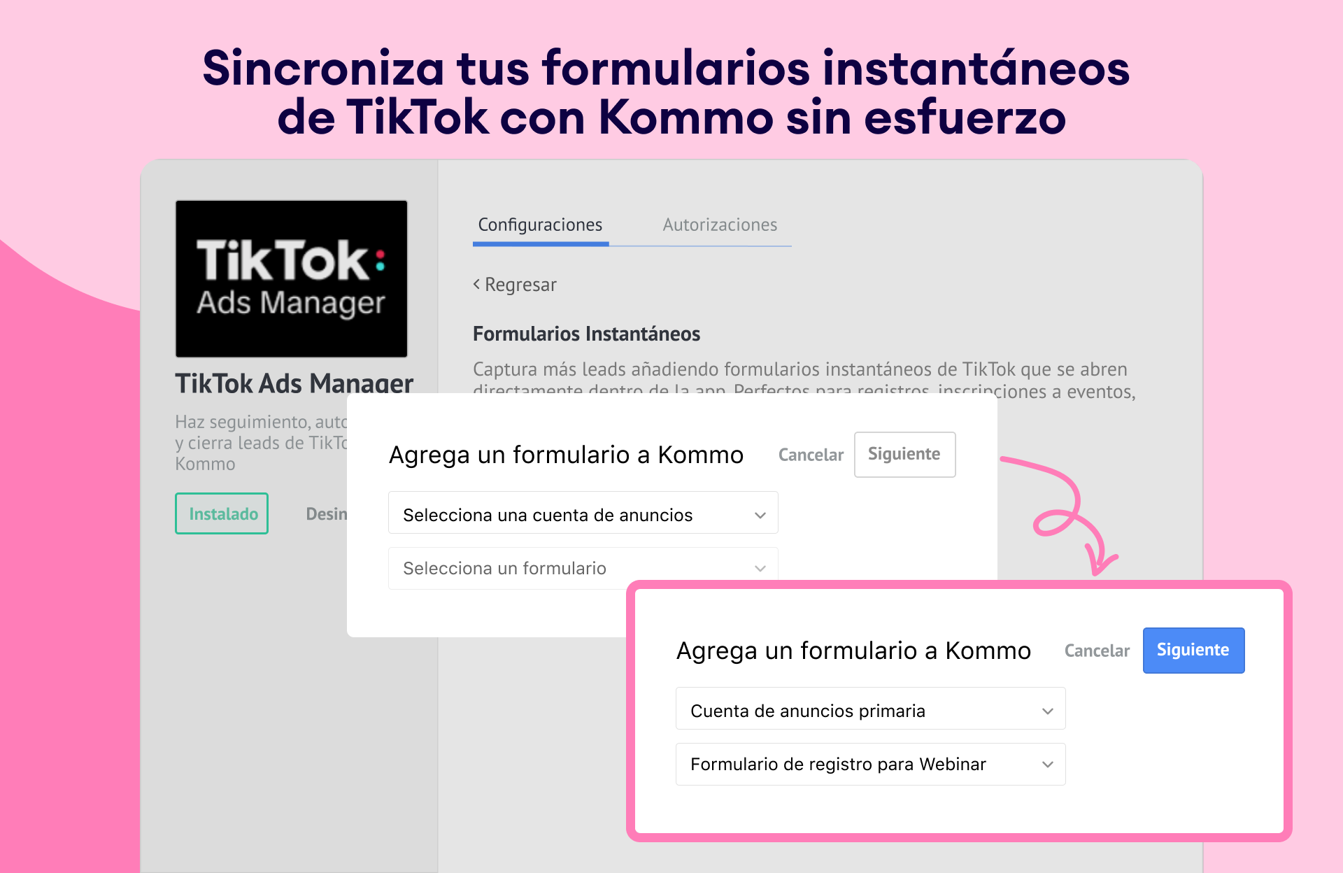 - Agrega Formularios Instantáneos de TikTok seleccionando la cuenta, mapeando los campos del formulario con los de Kommo y asignando etiquetas o etapas del embudo.