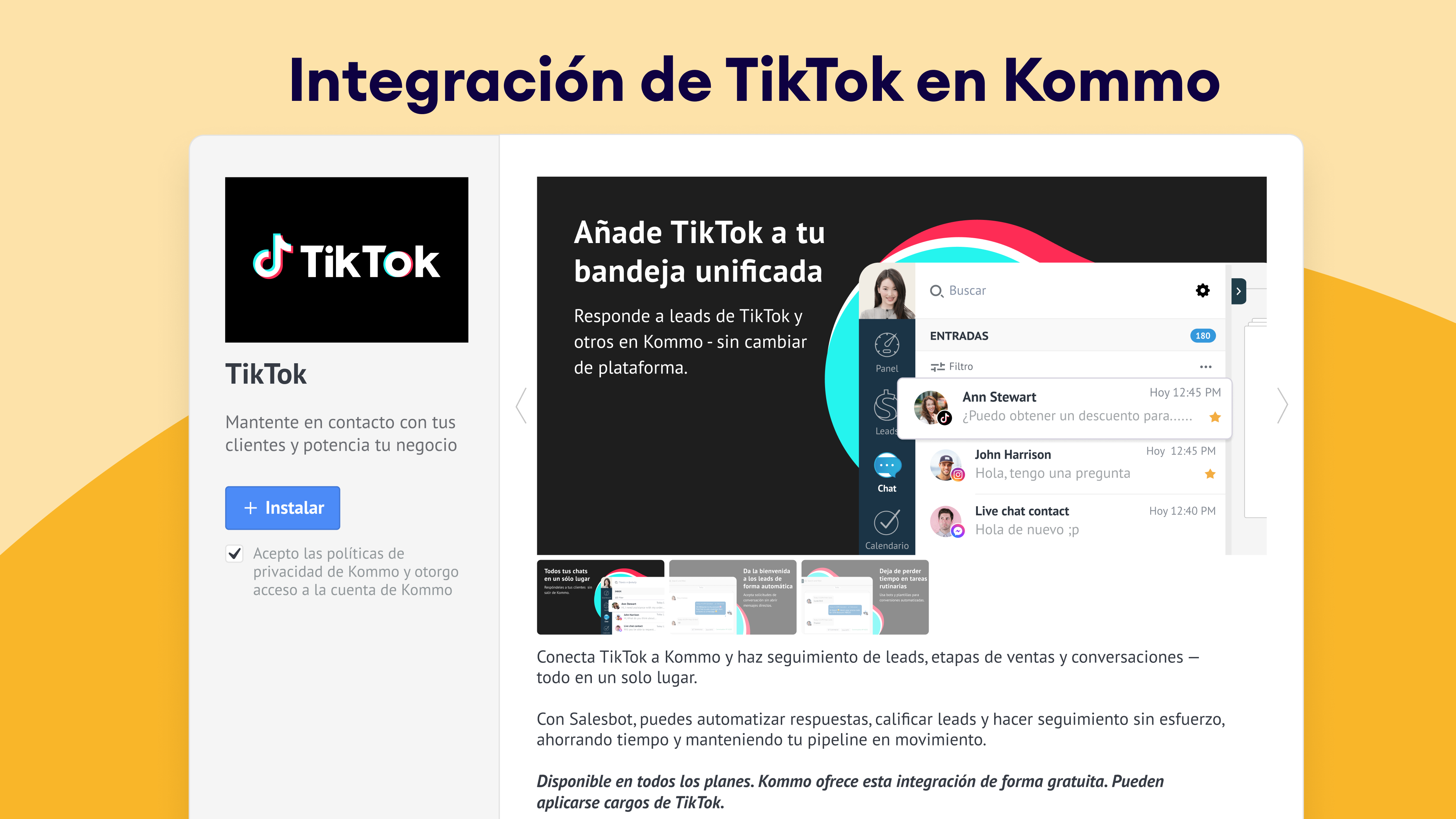 Para los negocios modernos, TikTok es una herramienta vital para llegar y conectar con audiencias diversas. Puedes atraer nuevos prospectos y mantener relaciones duraderas ofreciendo contenido divertido e informativo, y relacionándote directamente con los espectadores. Esta integración incorpora la mensajería de TikTok Business dentro de Kommo, brindándote una forma más inteligente de gestionar tus conexiones valiosas.