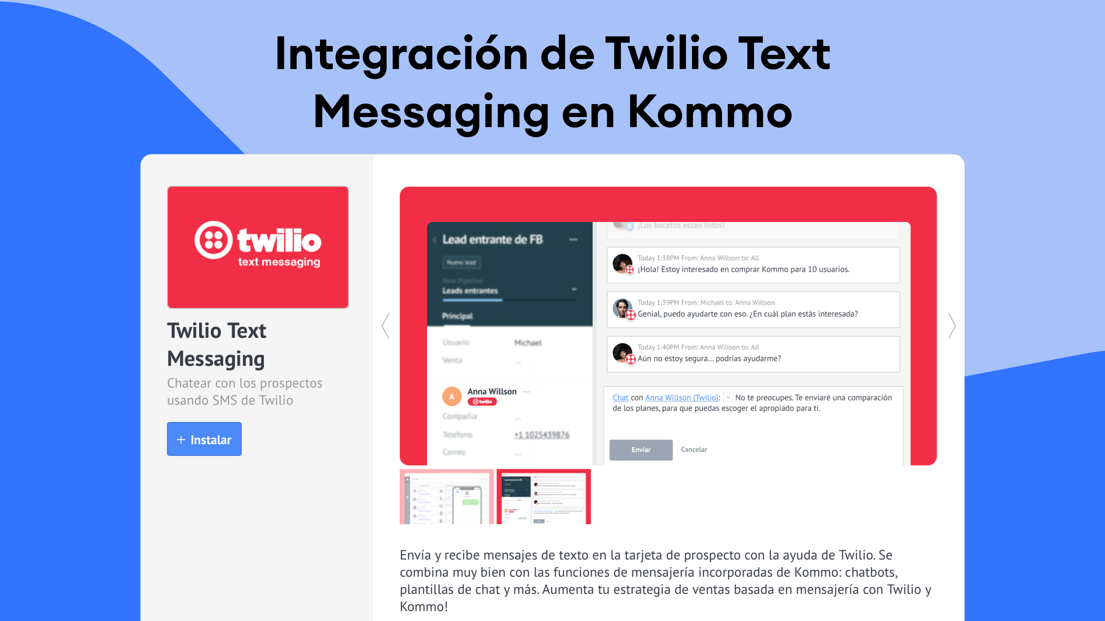 La integración de mensajería de texto de Twilio en Kommo te permite enviar y recibir mensajes directamente desde tu CRM. Al conectar Twilio, puedes automatizar flujos de comunicación, interactuar con prospectos de manera efectiva y mantener un registro completo de todas las interacciones. Esta integración mejora tu capacidad de llegar a los clientes a través de SMS, garantizando una comunicación oportuna y personalizada.