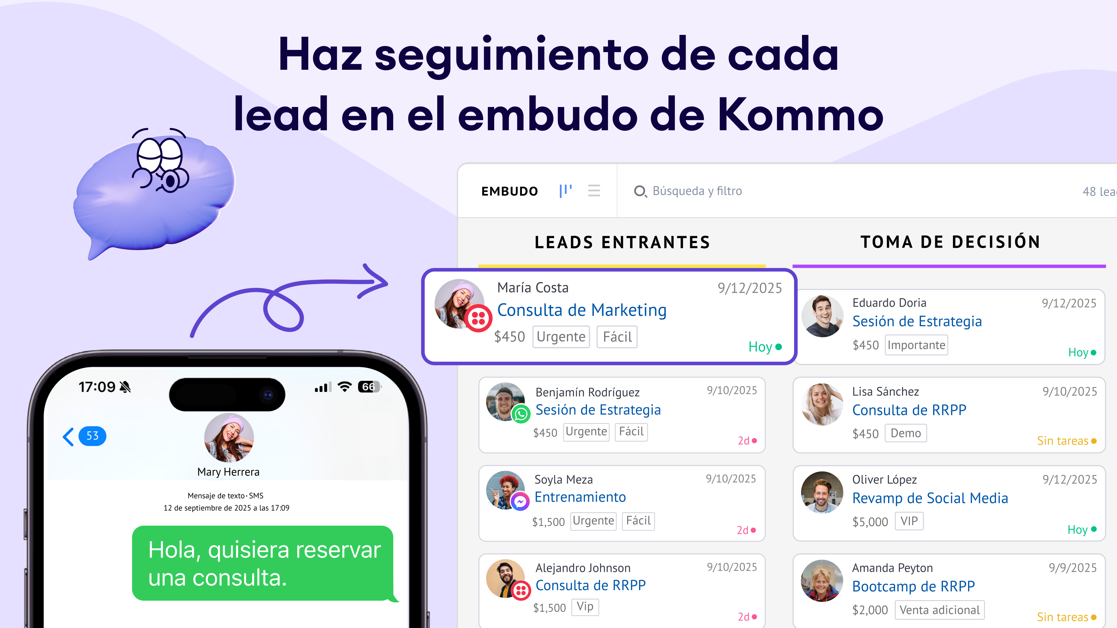 Twilio por sí solo es una herramienta de SMS muy potente, pero dentro de Kommo se convierte en mucho más. Kommo transforma la mensajería en un centro de ventas y comunicación totalmente integrado. En lugar de usar varias aplicaciones, tu equipo puede enviar, rastrear y organizar SMS junto con cada contacto y negocio. Automatizaciones, plantillas inteligentes y visibilidad multicanal convierten los mensajes en una ventaja estratégica: te ayudan a cerrar más rápido y mantener las conversaciones sin perder el ritmo.