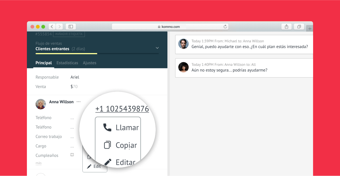 - Haga clic en un número de teléfono para realizar una llamada