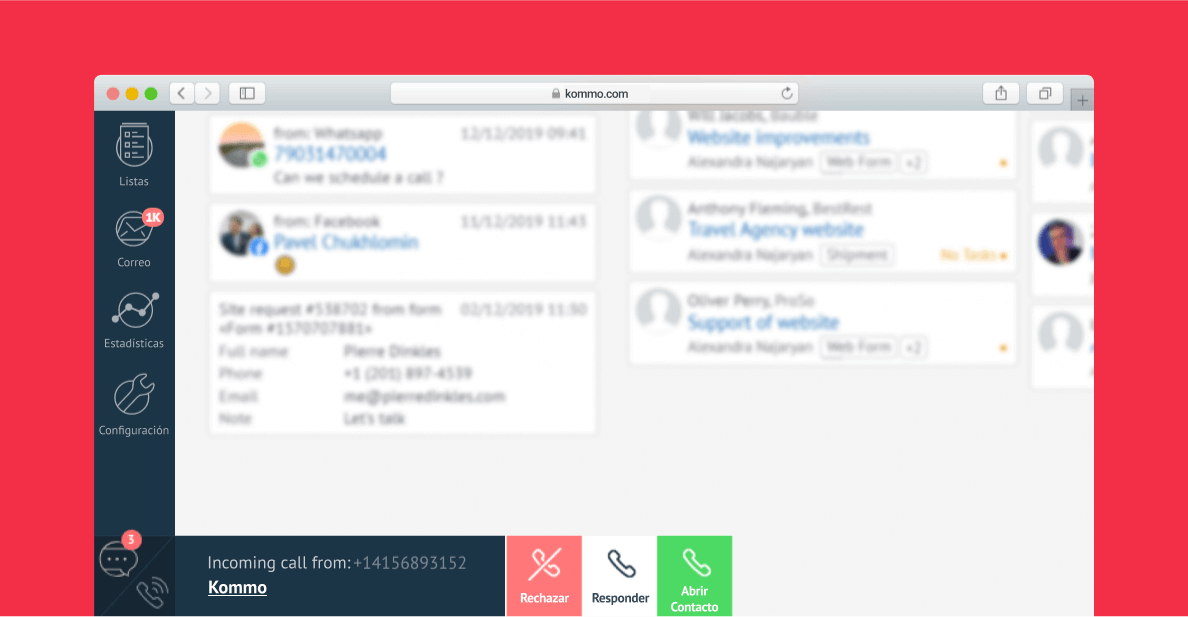 Al integrar Twilio, agregará funciones similares a las de un centro de llamadas en su cuenta Kommo. Puede organizar llamadas mediante tareas y recordatorios. Todas las llamadas se guardan y se pueden reproducir en la tarjeta de prospecto. Obtenga más de ambas plataformas agregando telefonía en su cuenta Kommo.