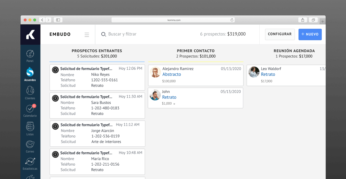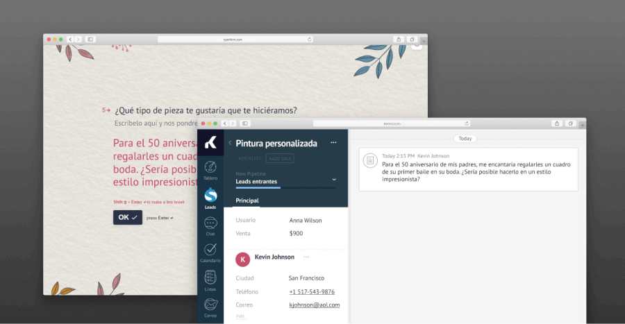 Agregue Typeform como fuente de prospectos en su embudo y las nuevas respuestas crearán una tarjeta de prospectos en Kommo. Es una excelente herramienta de generación de prospectos que le ayudará a recopilar toda la información que necesitas de los prospectos. Una vez que instale la integración, puede asignar las preguntas del formulario y hacer que se completen automáticamente en los campos de la tarjeta de prospectos cada vez que se envíe el formulario. Una vez que se genera el prospecto, puede emprender el viaje de ventas de Kommo y convertirse en uno de sus clientes.