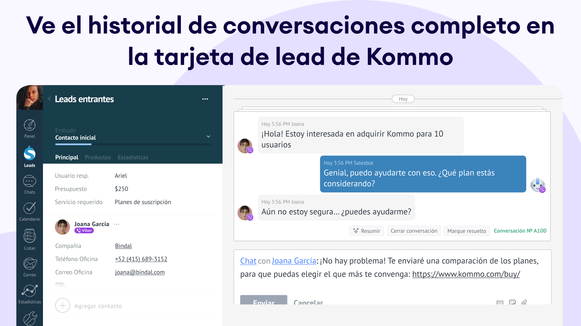 • Gestión de chats sin interrupciones: Responde mensajes directamente desde la tarjeta del lead, manteniendo toda la comunicación en un solo lugar organizado.