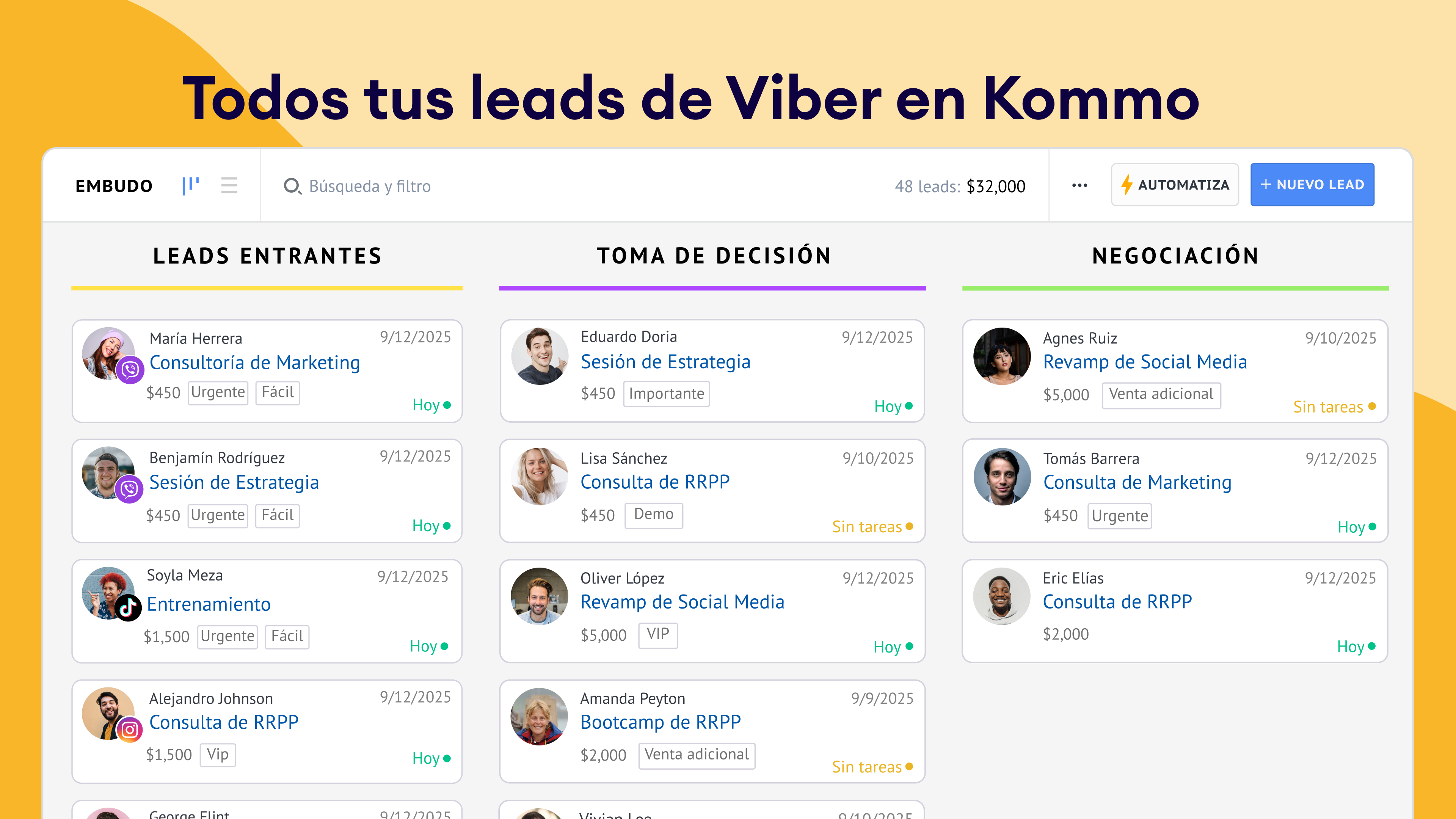 Captura instantánea de leads: Cada vez que un nuevo cliente te envía un mensaje en Viber, se crea automáticamente un lead en tu embudo de ventas, sin necesidad de ingresar datos manualmente.