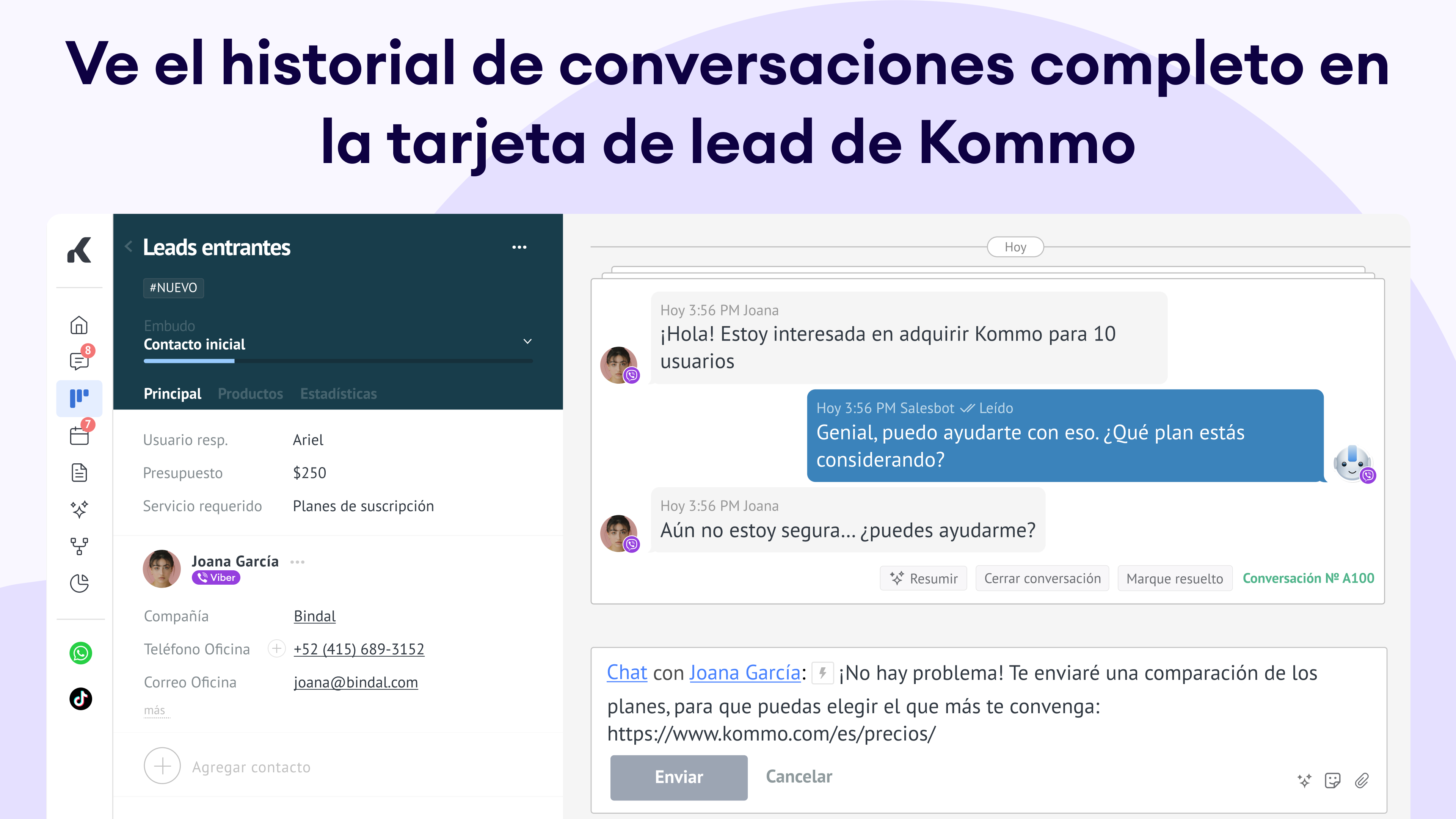 Gestión de chats sin interrupciones: Responde mensajes directamente desde la tarjeta del lead, manteniendo toda la comunicación en un solo lugar organizado.