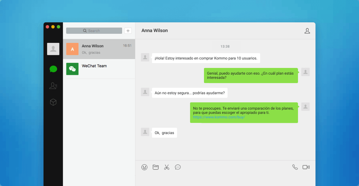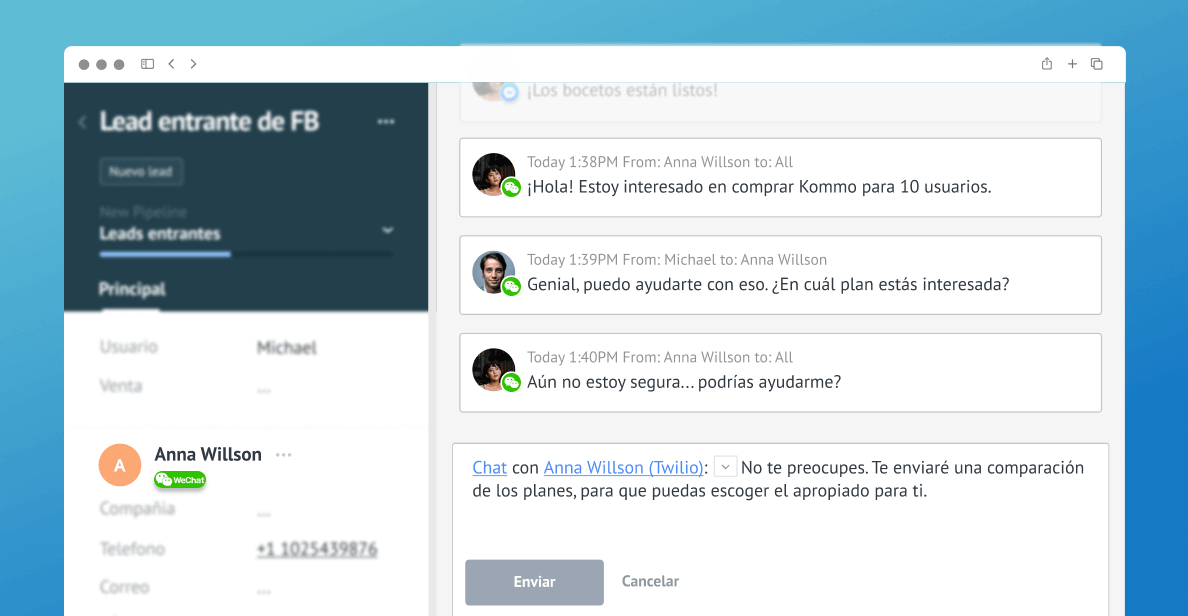 Convierta WeChat en una herramienta de generación de prospectos que le ayudará a conseguir más ventas y fidelizar a sus clientes. Las funciones de mensajería de Kommo le permitirán responder a los mensajes de WeChat directamente en Kommo. Toda la comunicación con los clientes actuales y potenciales se almacena en la tarjeta de prospectos. Si alguien se pone en contacto contigo en WeChat, se crea automáticamente una tarjeta de prospecto. Incluso puede automatizar el proceso de comunicación con el poder de Ventabot de Kommo.